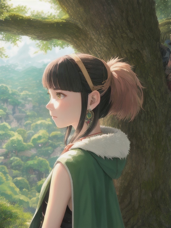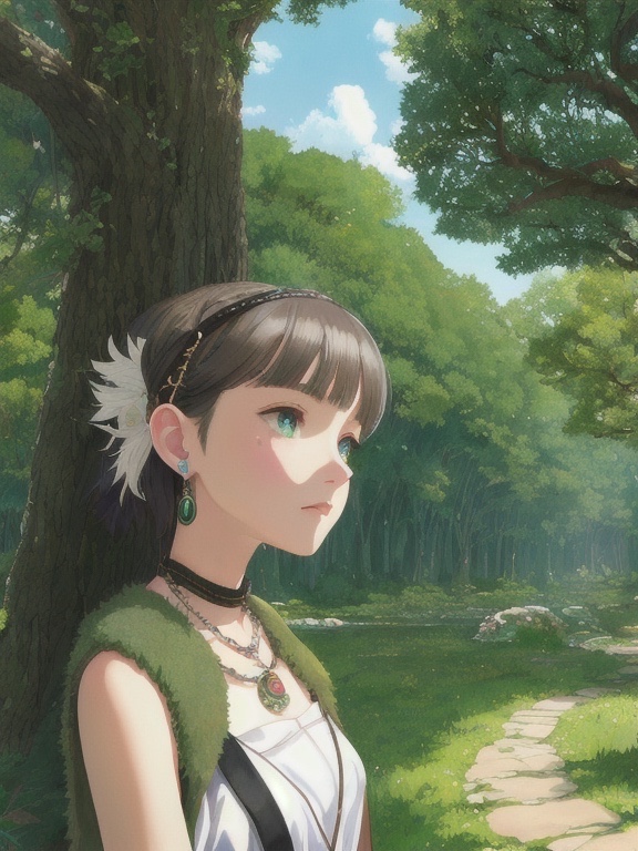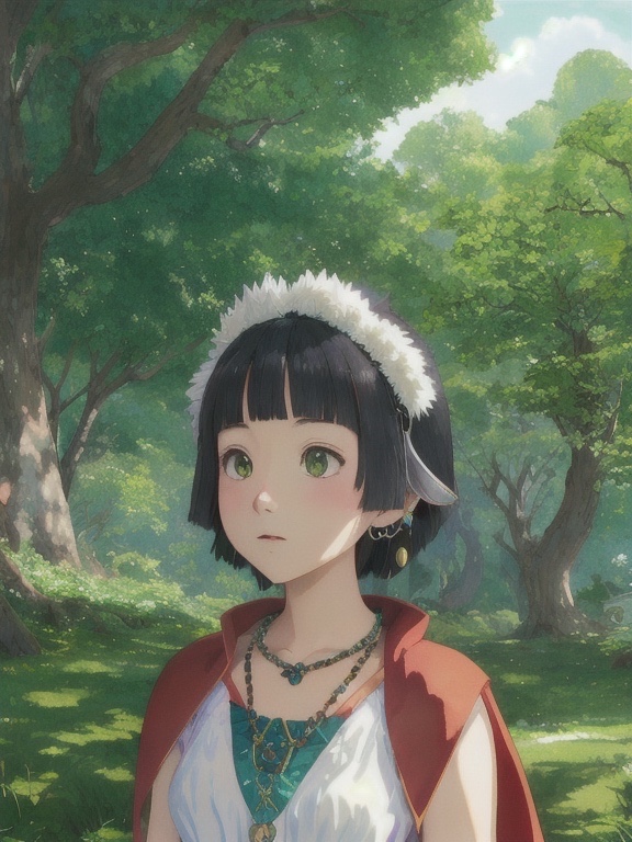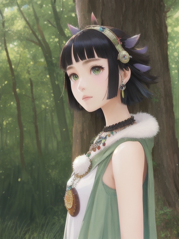 ((吉卜力风格)),(幽灵公主),一个女孩,臂章,刘海,黑发,黑色短裙,环状饰品,耳环,面部彩绘,流动的头发,森林,毛绒披肩,绿色眼睛,珠宝,看向观者,自然,室外,分开的刘海,短发,无袖上衣,单人,牙骨项链,树,展开的姿态,动漫色彩,水彩风格
