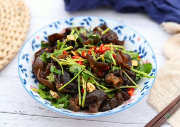 木耳和料汁混合均匀,再倒入香菜搅拌几下,就可以装盘食用了。