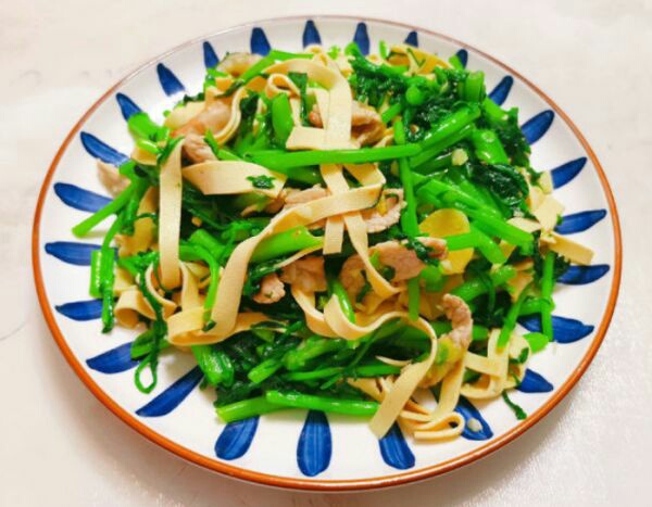 接着倒入豆皮翻炒均匀,再倒入肉丝翻炒。最后加入少许盐、鸡精快速几下出锅。