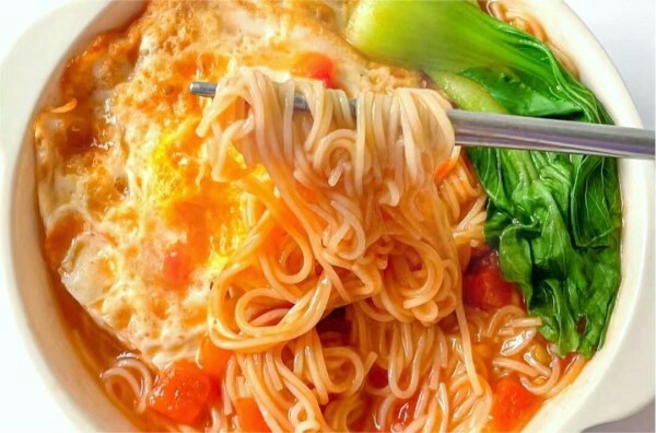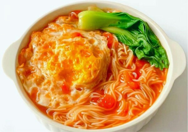 步骤三:锅中倒一点油煎一个鸡蛋,然后盛出。锅中留少许底油,下入番茄块,炒出番茄汁,然后倒入调好的料汁,中小火煮开以后,放入面条和荷包蛋,煮至面条熟透即可。