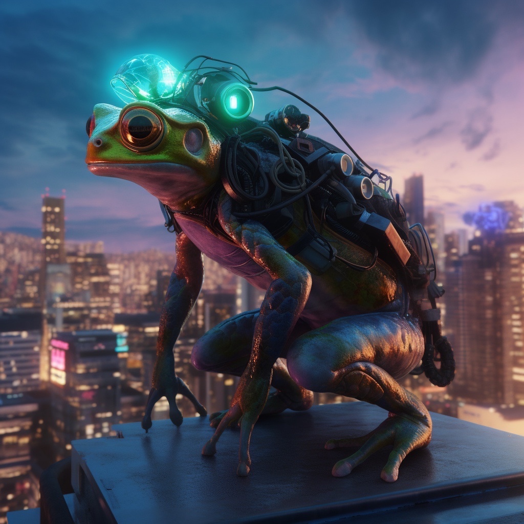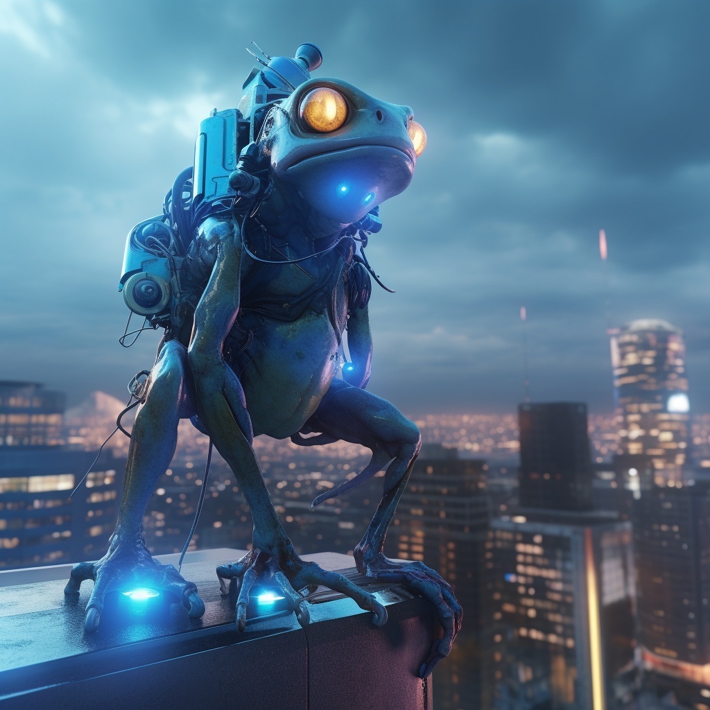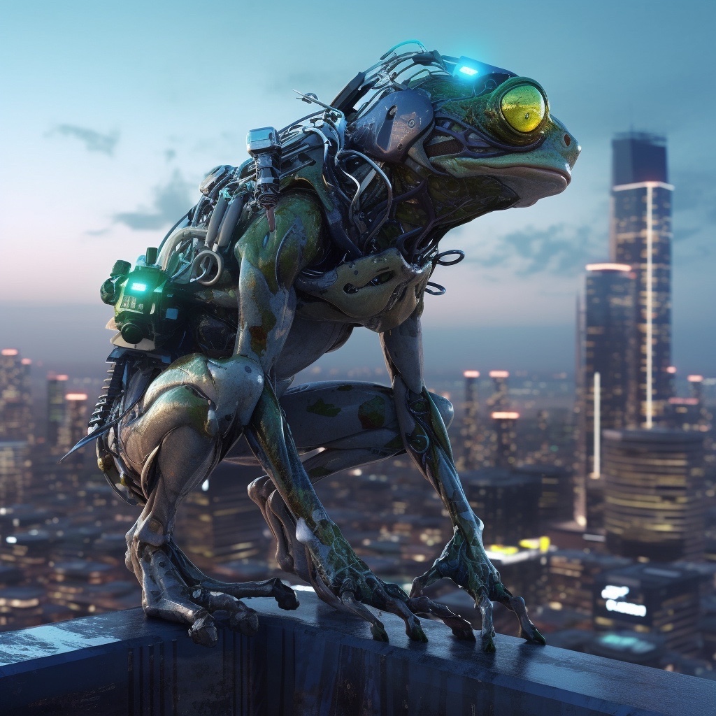 科幻机械风格的青蛙画作,它站立在未来都市的屋顶,身上装备着先进的生物技术装置。