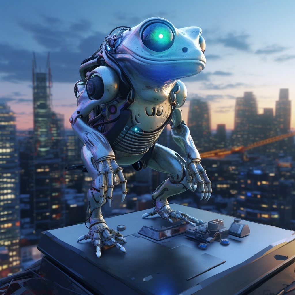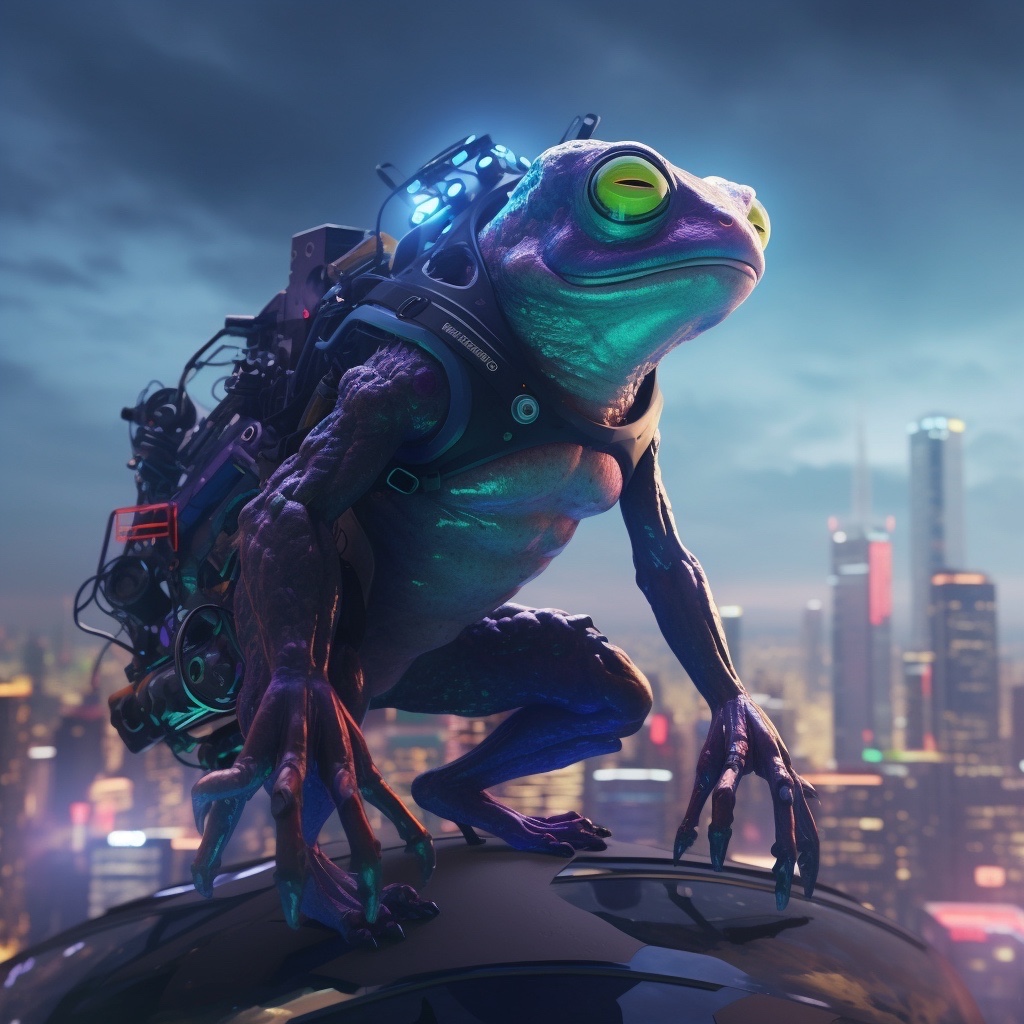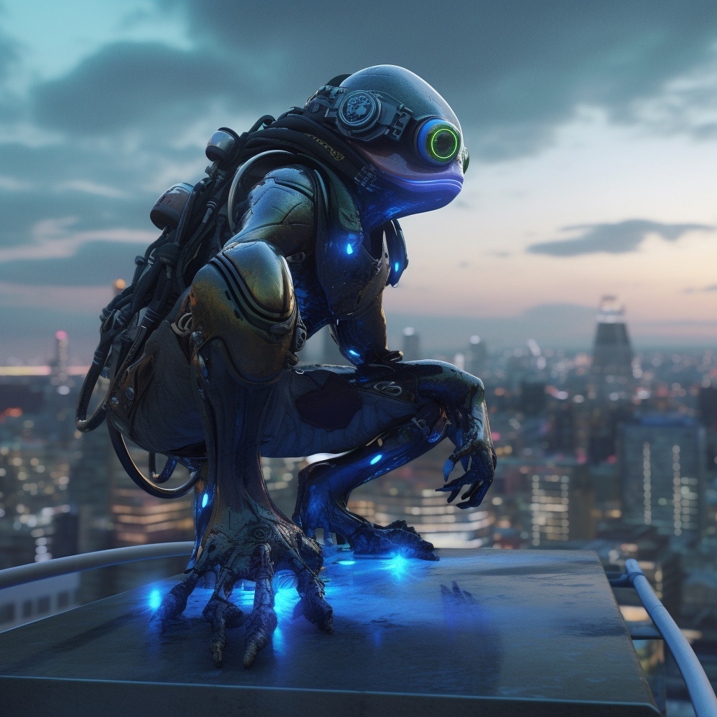 科幻机械风格的青蛙画作,它站立在未来都市的屋顶,身上装备着先进的生物技术装置。