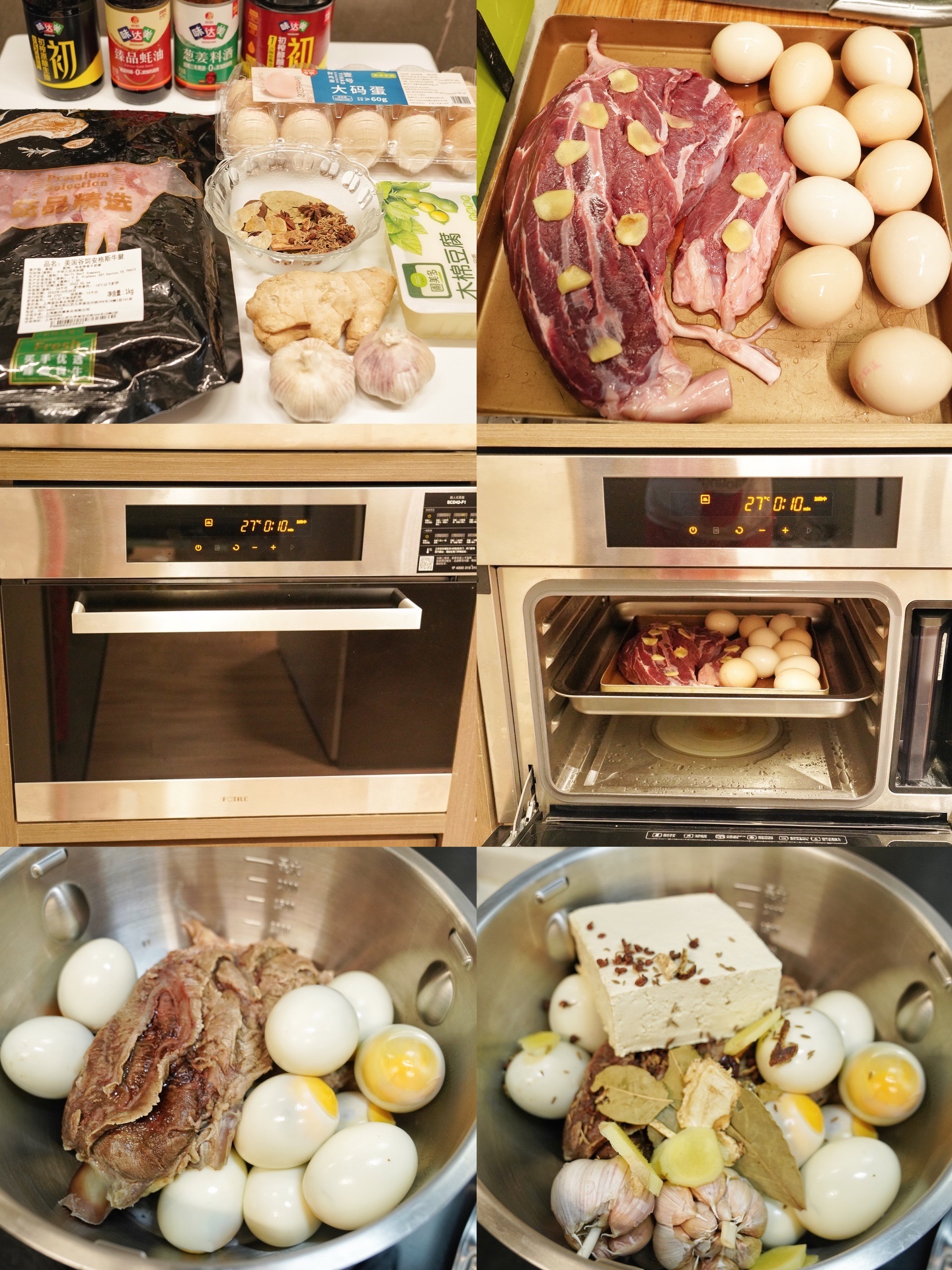 4、把牛腱子和鸡蛋放入预热好的蒸箱中层蒸10分钟