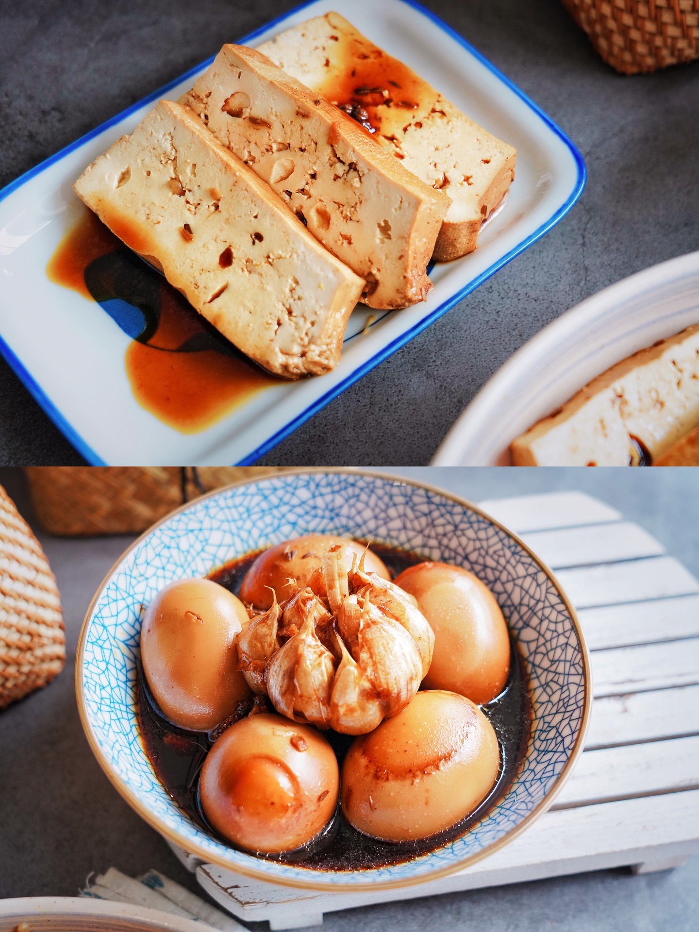 【潮汕卤水香干牛腱子卤蛋拼盘】牛腱子1000克,豆腐400克,鸡蛋10颗,草果1个,陈皮5克,桂皮1块,香叶3片,花椒3克,孜然3克,八角2个,当归1片,干红辣椒2根,生抽45毫升,蚝油30克,料酒15毫升,老抽30毫升,黄冰糖10克,盐15克,姜1块,蒜头2个,植物油30毫升,开水1000毫升