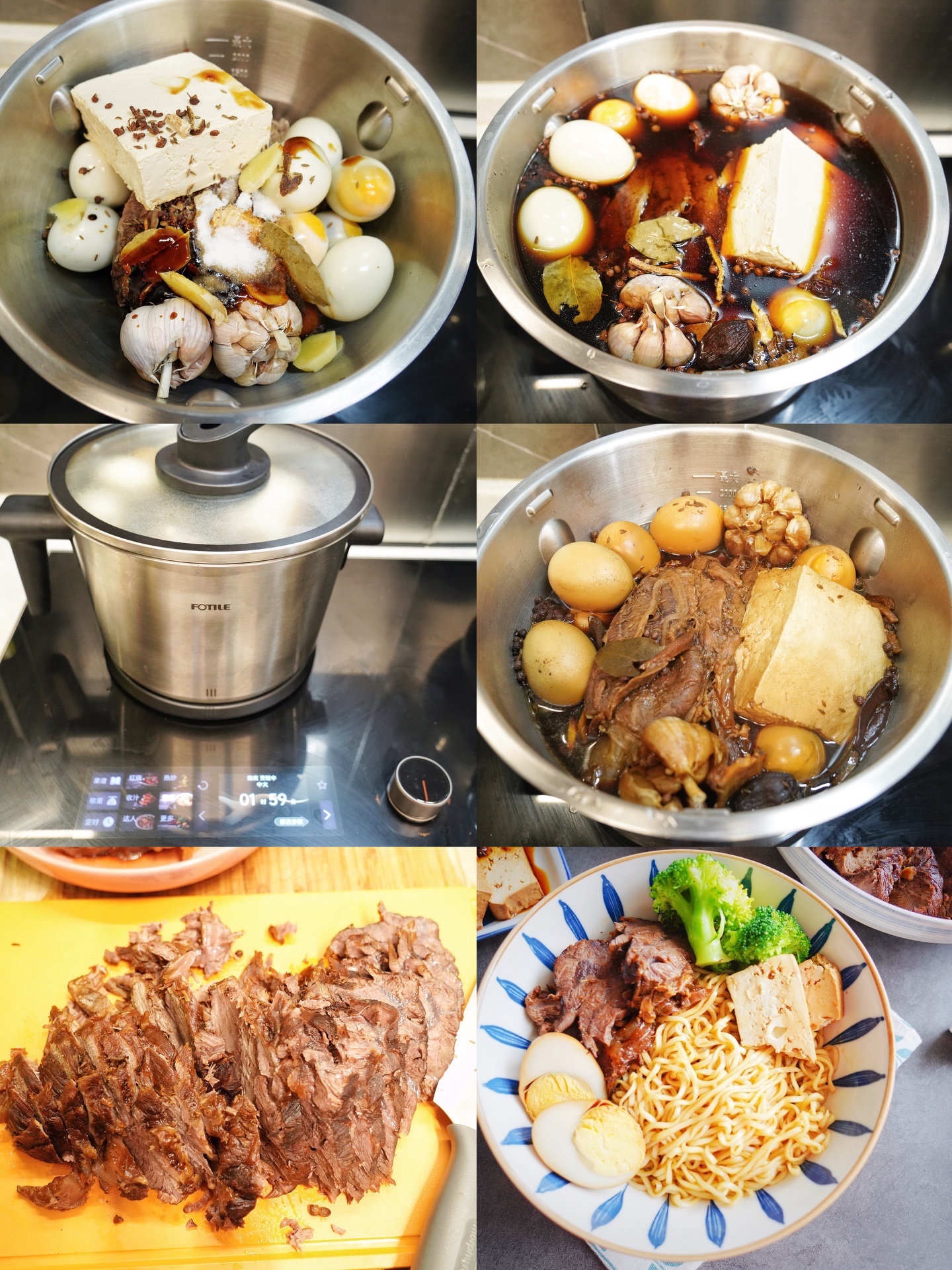5、把蒸好用清水冲去血沫的牛腱子喝剥壳的鸡蛋放入烹饪机中