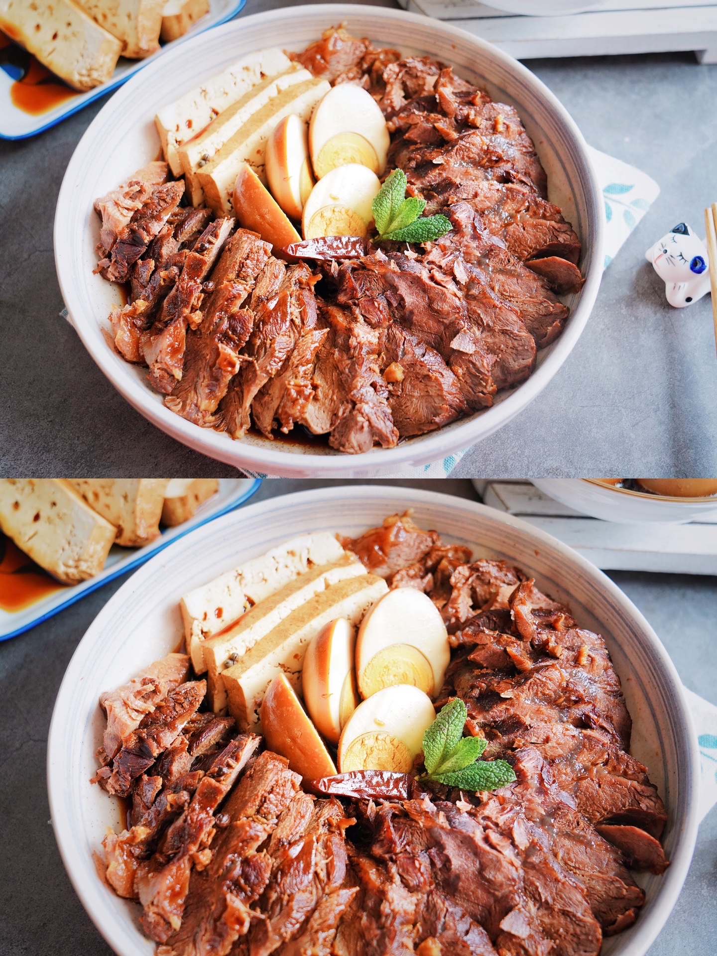 个人感觉卤五花肉吃了太肥腻,特别是春天这个季节里,每次吃卤水五花肉我都是会把肥肉部分弃之。而用牛腱子改良的卤水,不但吃了不油腻,味道还比猪肉的要香得多,并且还带嚼劲感。