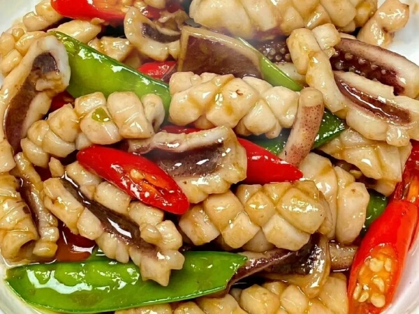 食材准备:鱿鱼、荷兰豆、小米辣、葱段、姜片。