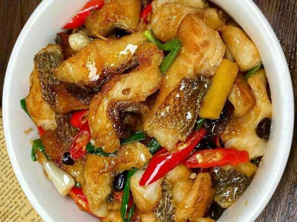 3、当味道被炒出来了以后,倒入煎好的鱼块,,加入葱段关火炒至断生,收干汤汁就可以出锅啦,鲜香美味。