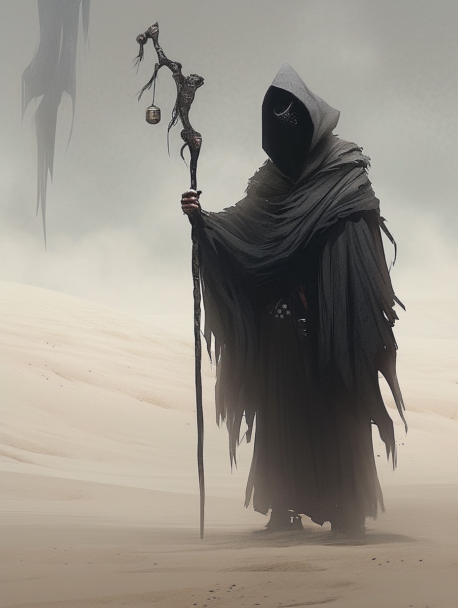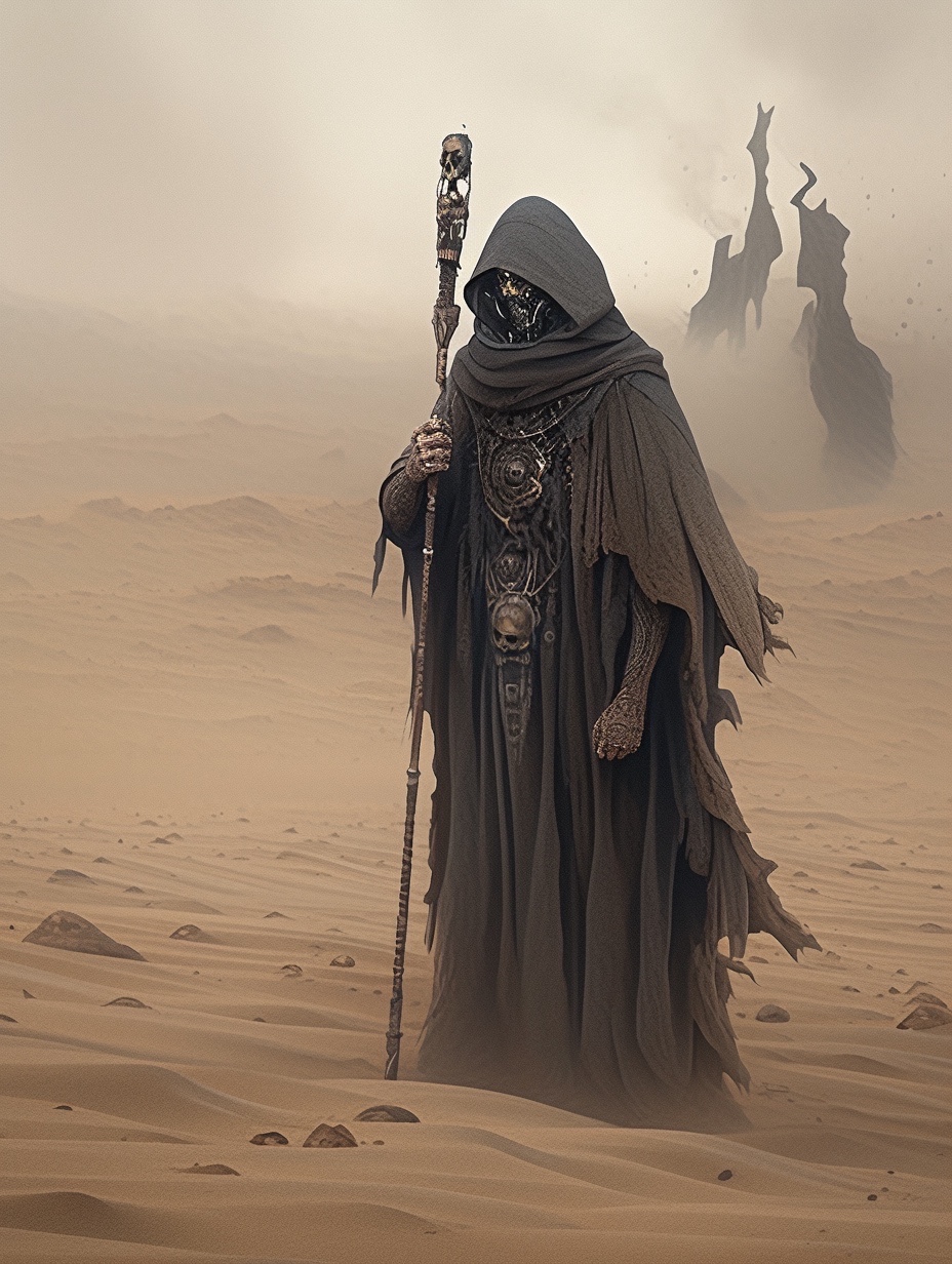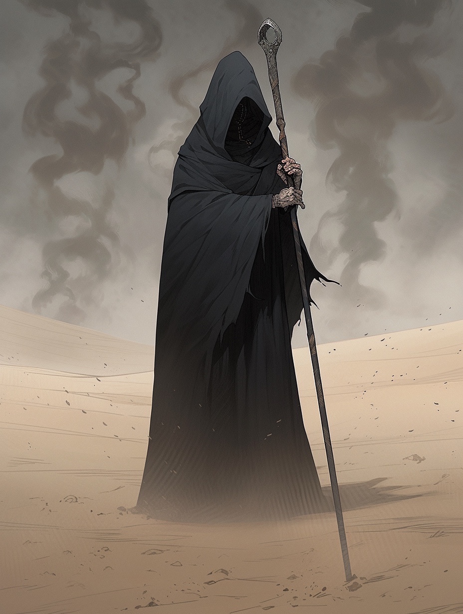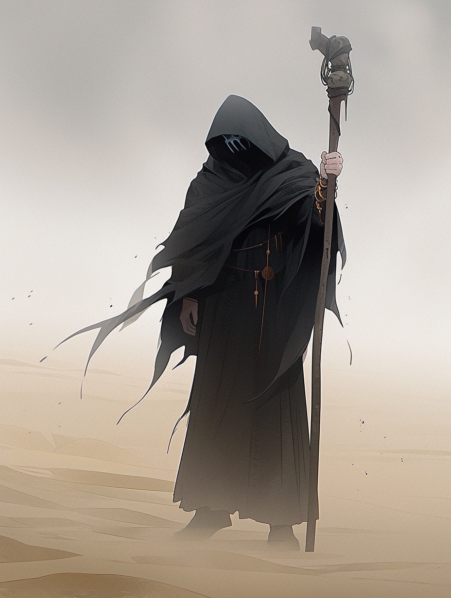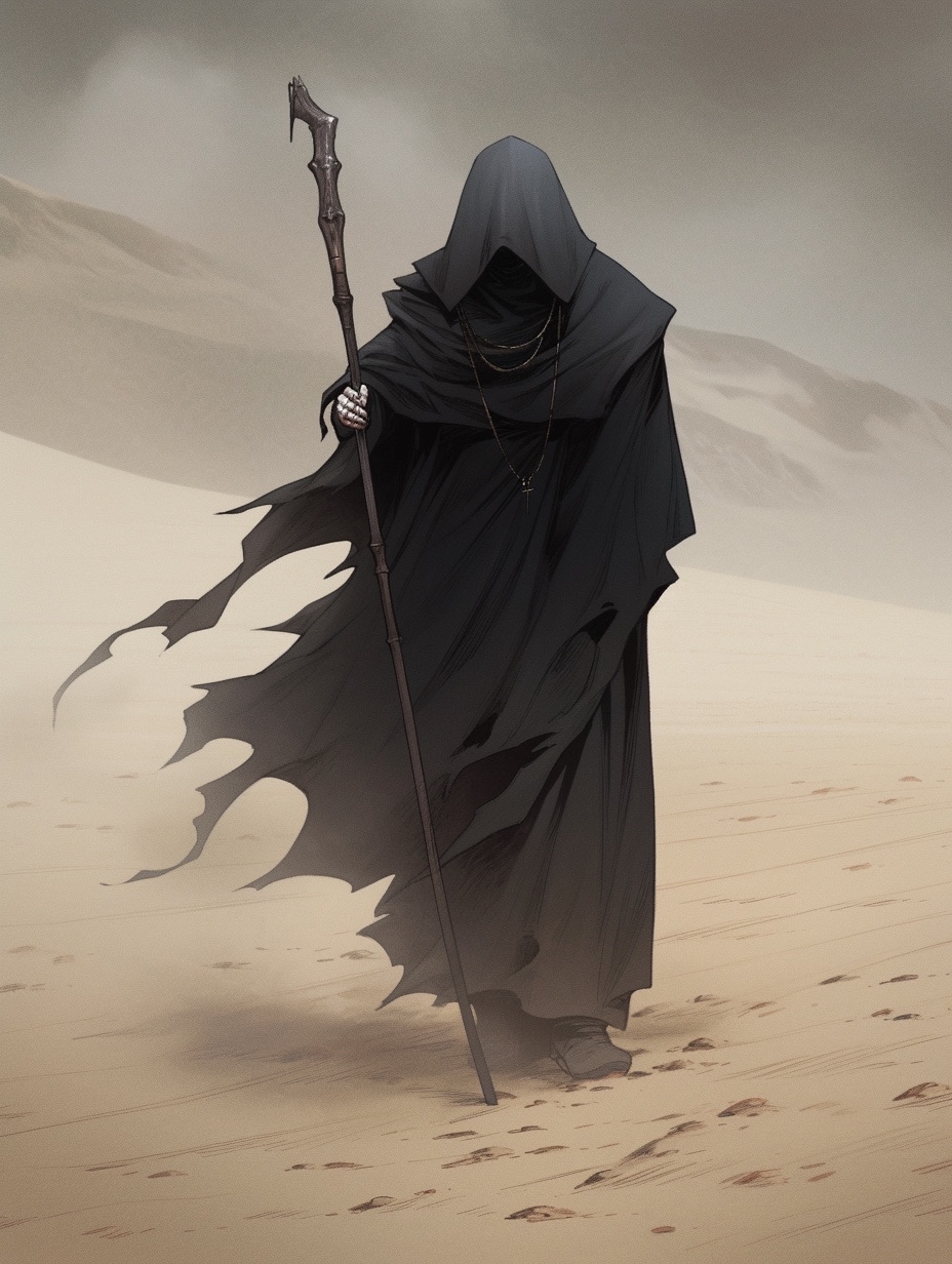这幅画作中,一位神秘的黑袍男子拿着黑色手杖站在荒凉的沙漠里。他的目光深邃,周围弥漫着一股神秘且不可侵犯的气氛。荒漠里没有生物,只有金黄的沙丘,整个场景神秘而庄严。🏜