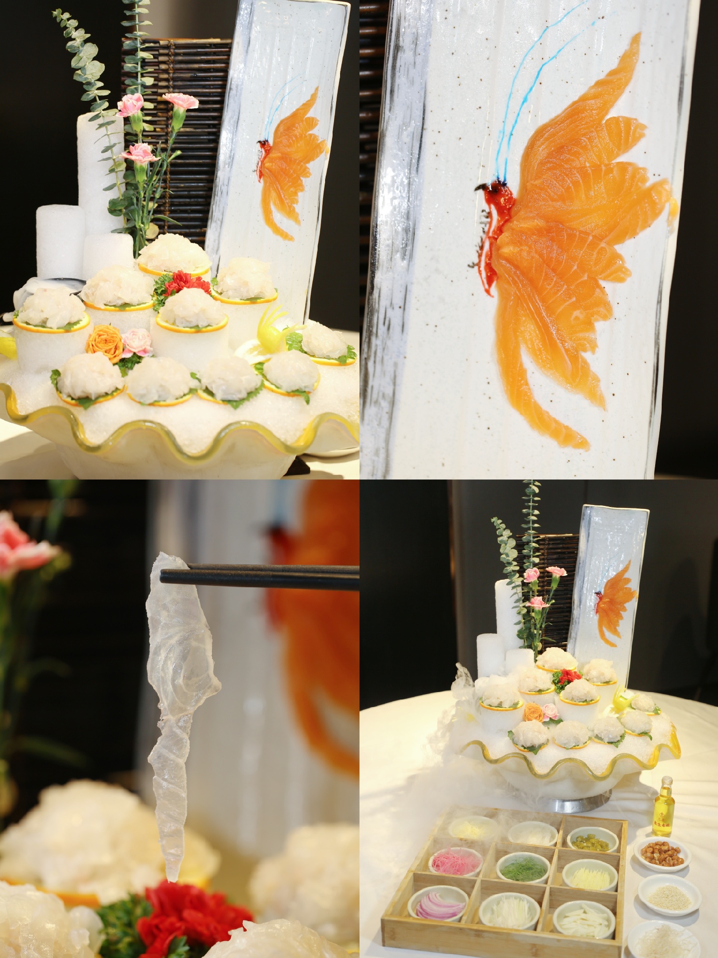 ①鱼生,鱼生透薄,直接显示师傅刀功的精湛,配上任君选择的九种佐料,蘸上芥末酱油、花生油,饕餮之味呼之欲出,一口接一口的鲜美鱼生,令人欲罢不能。