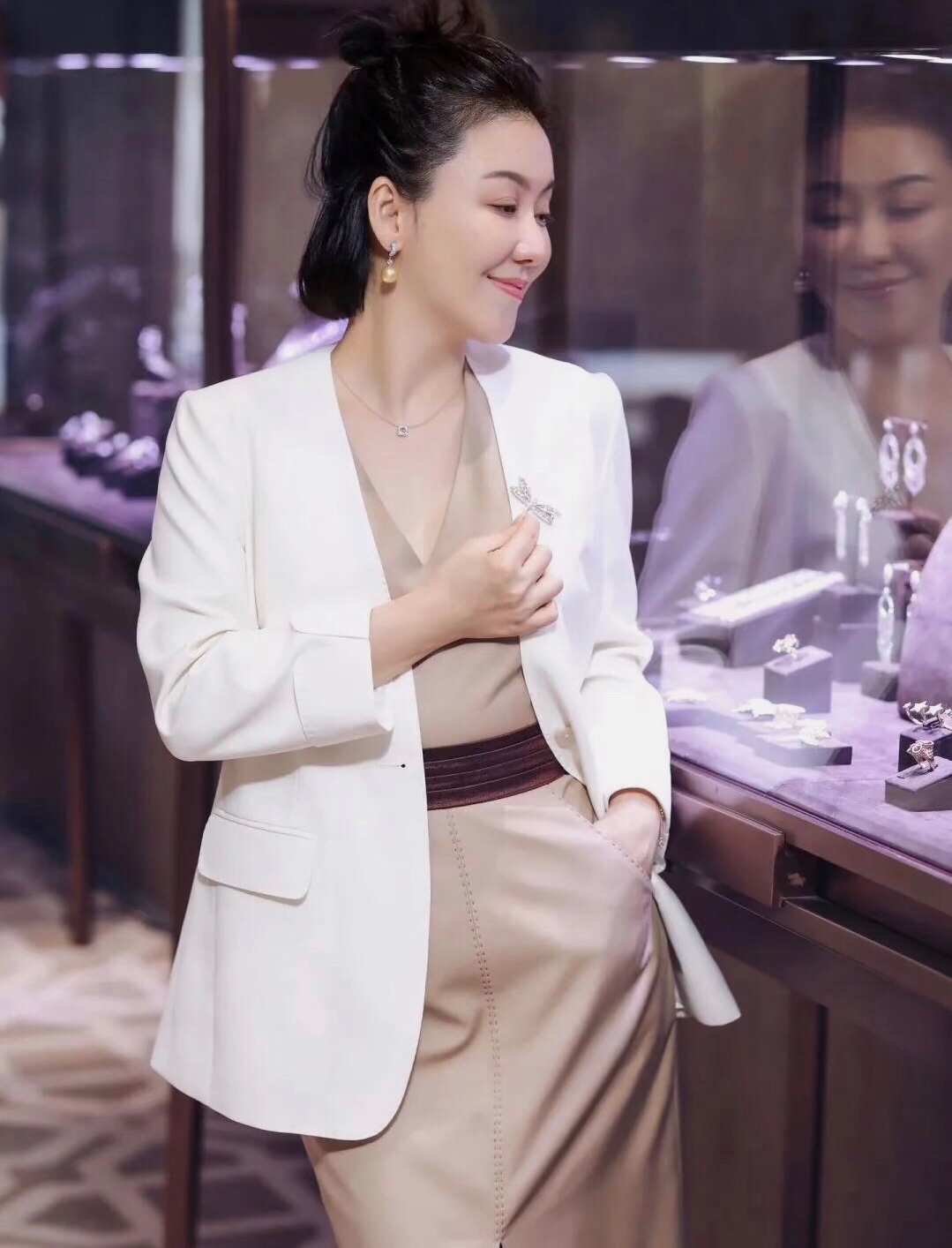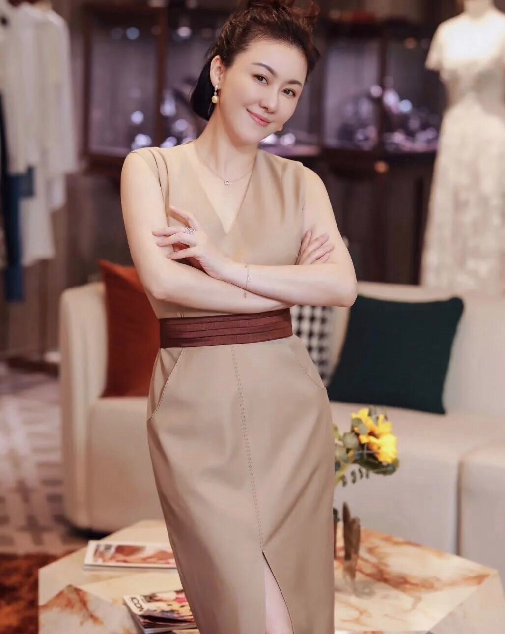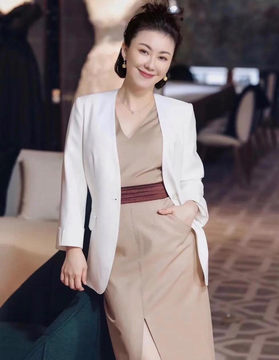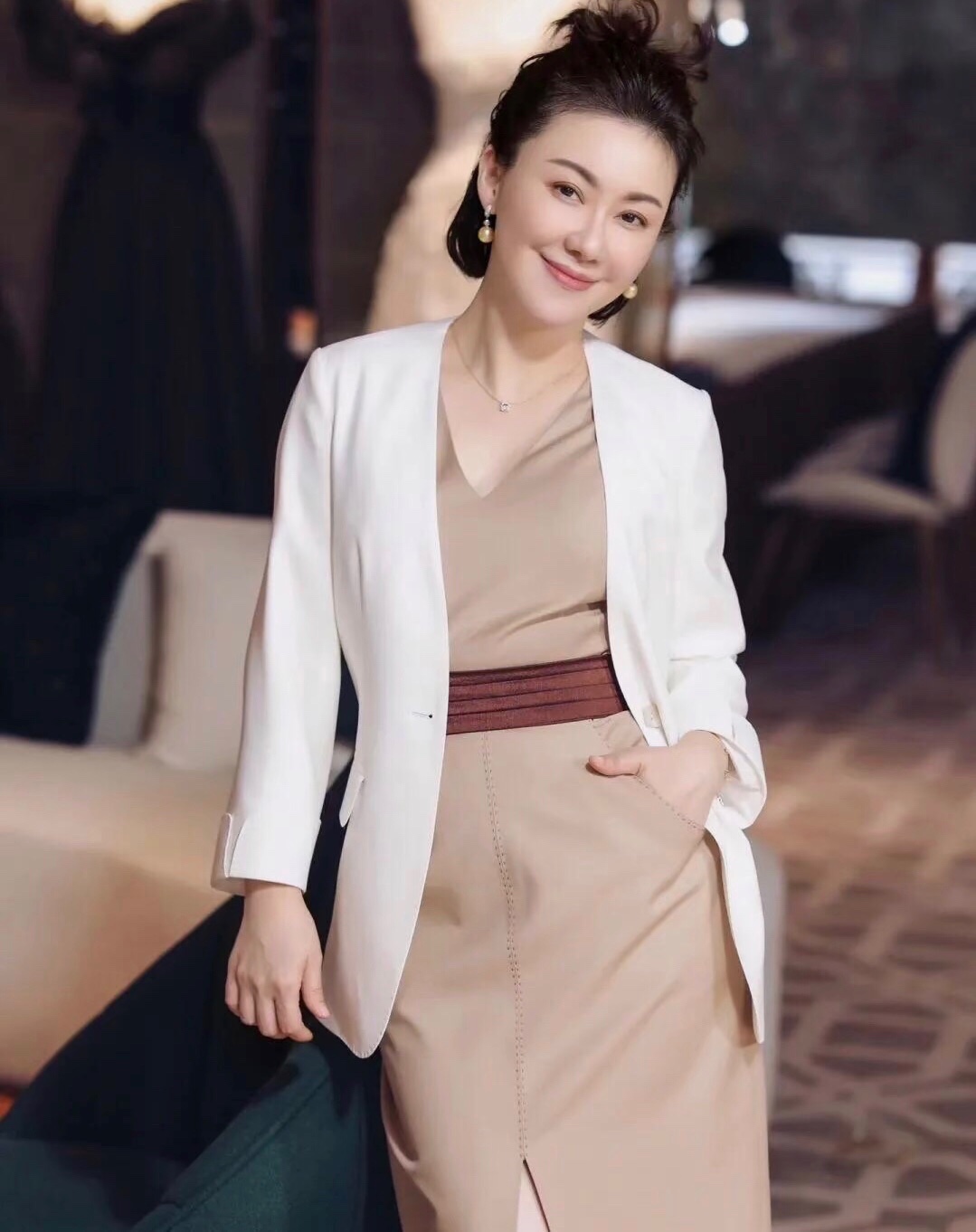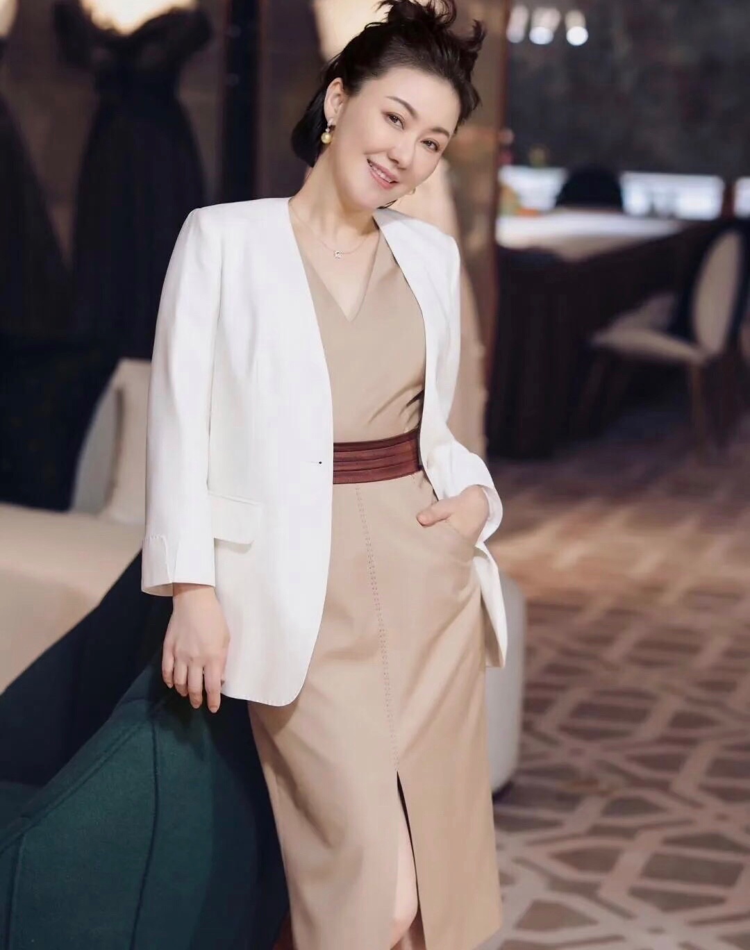 卡其色的连衣裙搭配白色西装外套,款式干净利落,可以轻松穿出气质感和高级形象。