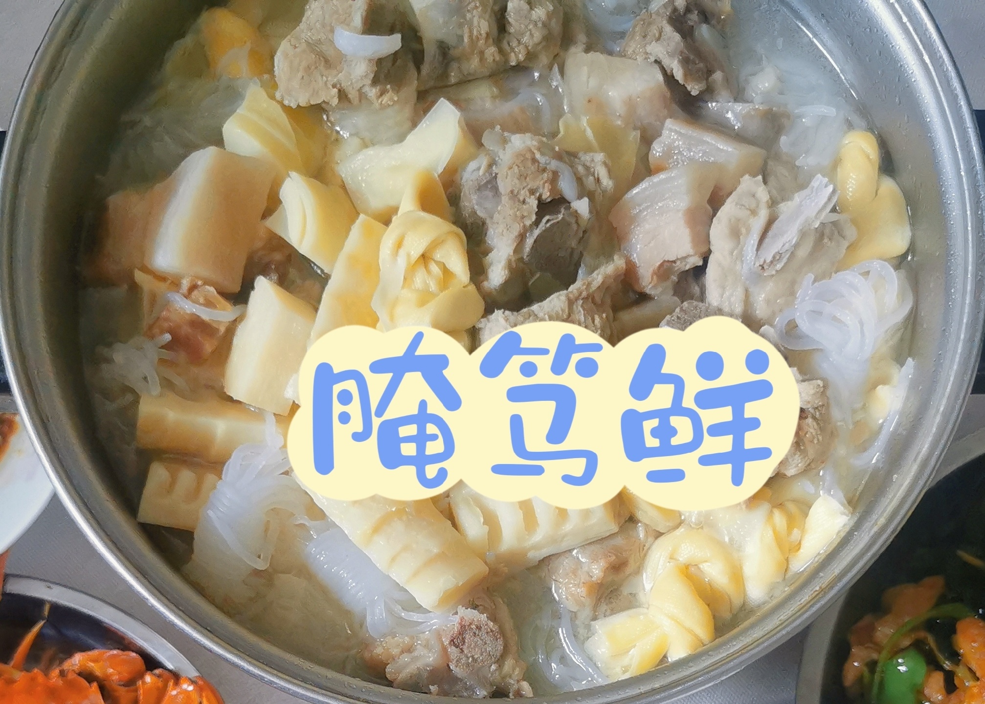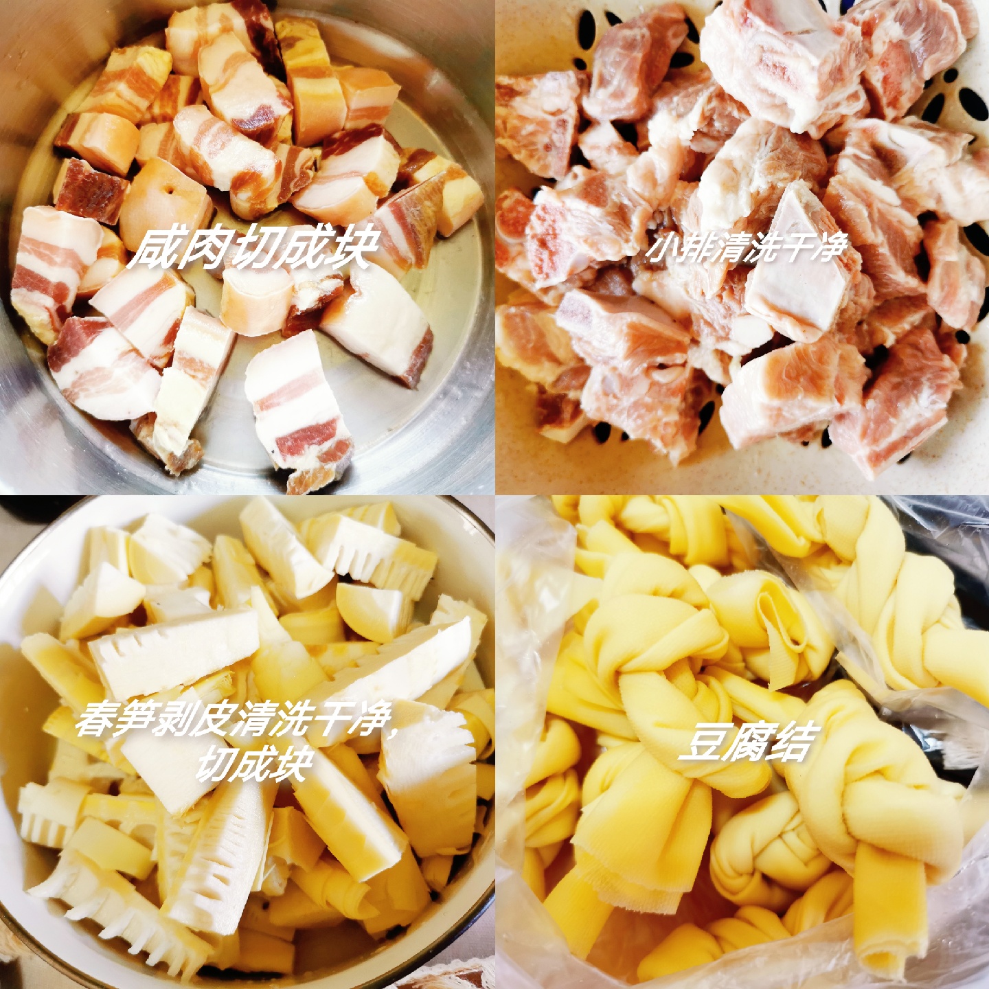 食材:咸肉,小排,春笋,豆腐结,魔芋结