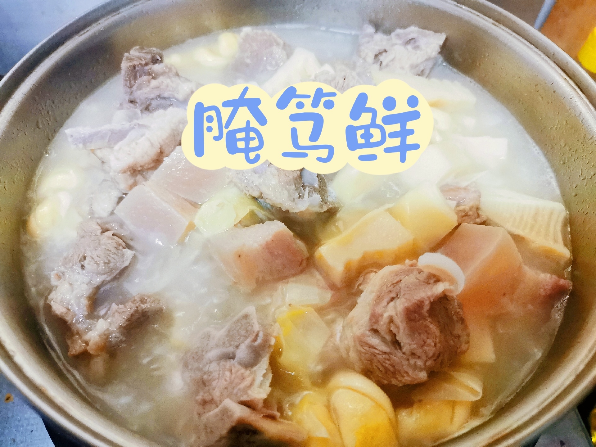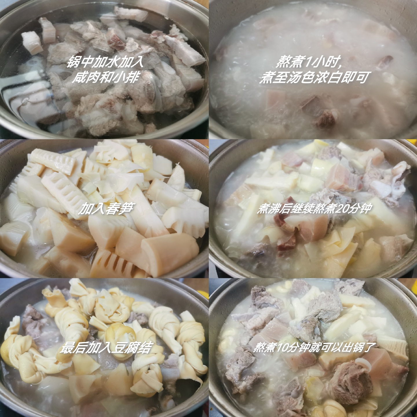 3、锅中加入咸肉,小排加入温水,煮开后煮上1小时,待汤色浓白加入春笋煮20分钟后加入豆腐结煮10分钟,即可出锅。小棉袄喜欢吃魔芋结,出锅前放了魔芋结,也可以放点青笋。