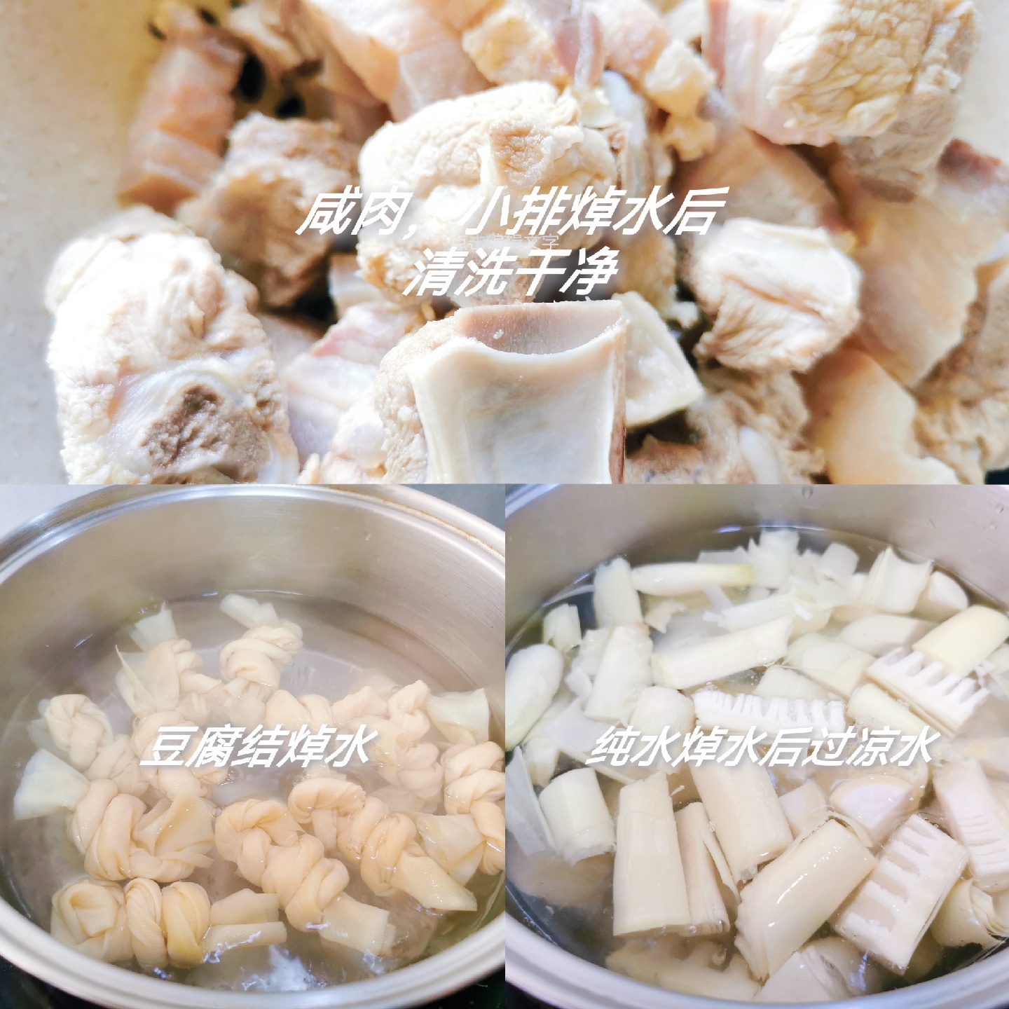 2、将咸肉,小排,豆腐结,春笋焯水,春笋焯水10分钟。咸肉,小排用温水清洗干净血沫,沥干水分,春笋用清水浸泡10分钟。