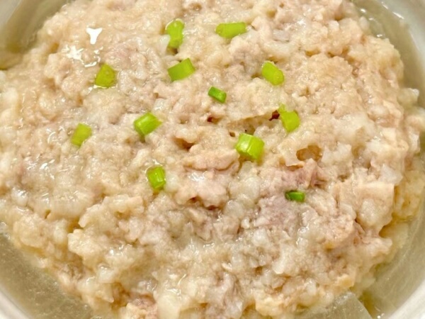 2、猪肉清洗干净剁成沫,山药削掉外皮洗净后剁成泥,全部放在一起,再加入酱油、淀粉、食用油,搅拌均匀。
