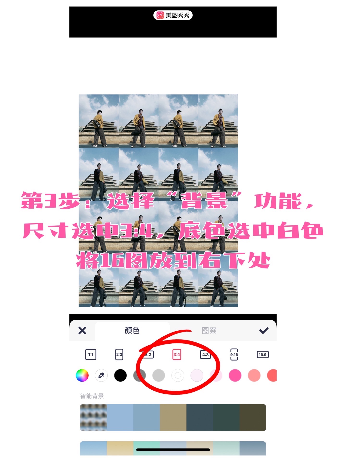 3️⃣选择“背景”功能,选中3:4,白底,以便将16图移到右下角;