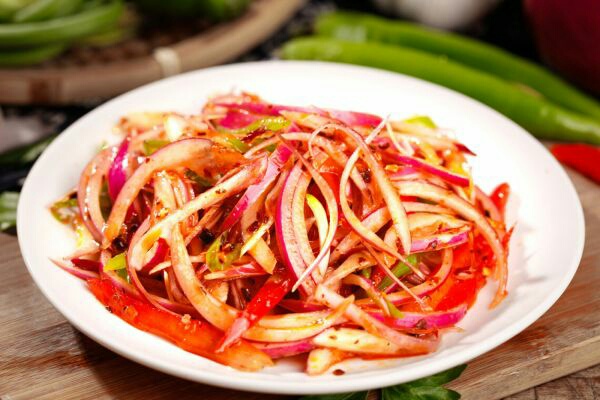 5、把泡完的洋葱丝捞出来把水沥干放入盆子中,同时放入青红椒丝,再倒入准备好的调料汁,搅拌均匀就可以享用啦。