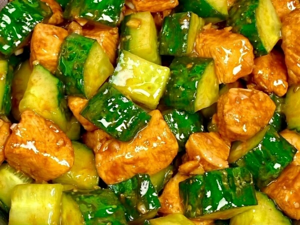 3、再次起锅烧油,油热后放入蒜末炒出香味,再放入黄瓜丁翻炒一会儿,炒至断生后放入鸡胸肉翻炒均匀。
