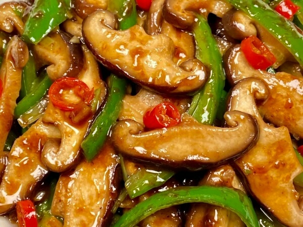 3、香菇也炒软后,加入食盐、蚝油、水淀粉,翻炒均匀炒入味,炒至酱汁浓稠,就可以出锅装盘开吃了。