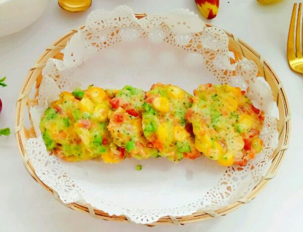 煮好后,将西蓝花切碎,和玉米、胡萝卜放在一起,再切点火腿肠碎放进去。