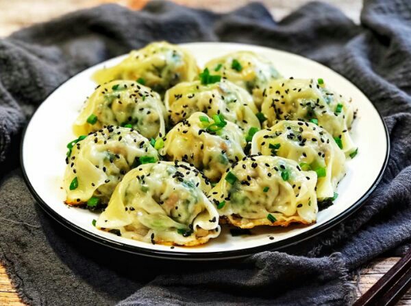 等水干了,撒些黑芝麻、葱花,再煎一两分钟,就做好了。没有馄饨换成饺子一样做。