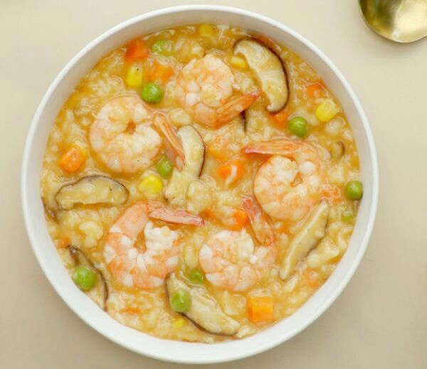 大虾去掉虾头,取出虾仁,去掉虾线,虾头、虾仁分别洗净。豌豆、玉米粒、胡萝卜丁、香菇片准备好,也可以换成别的蔬菜,比如土豆、西蓝花等。