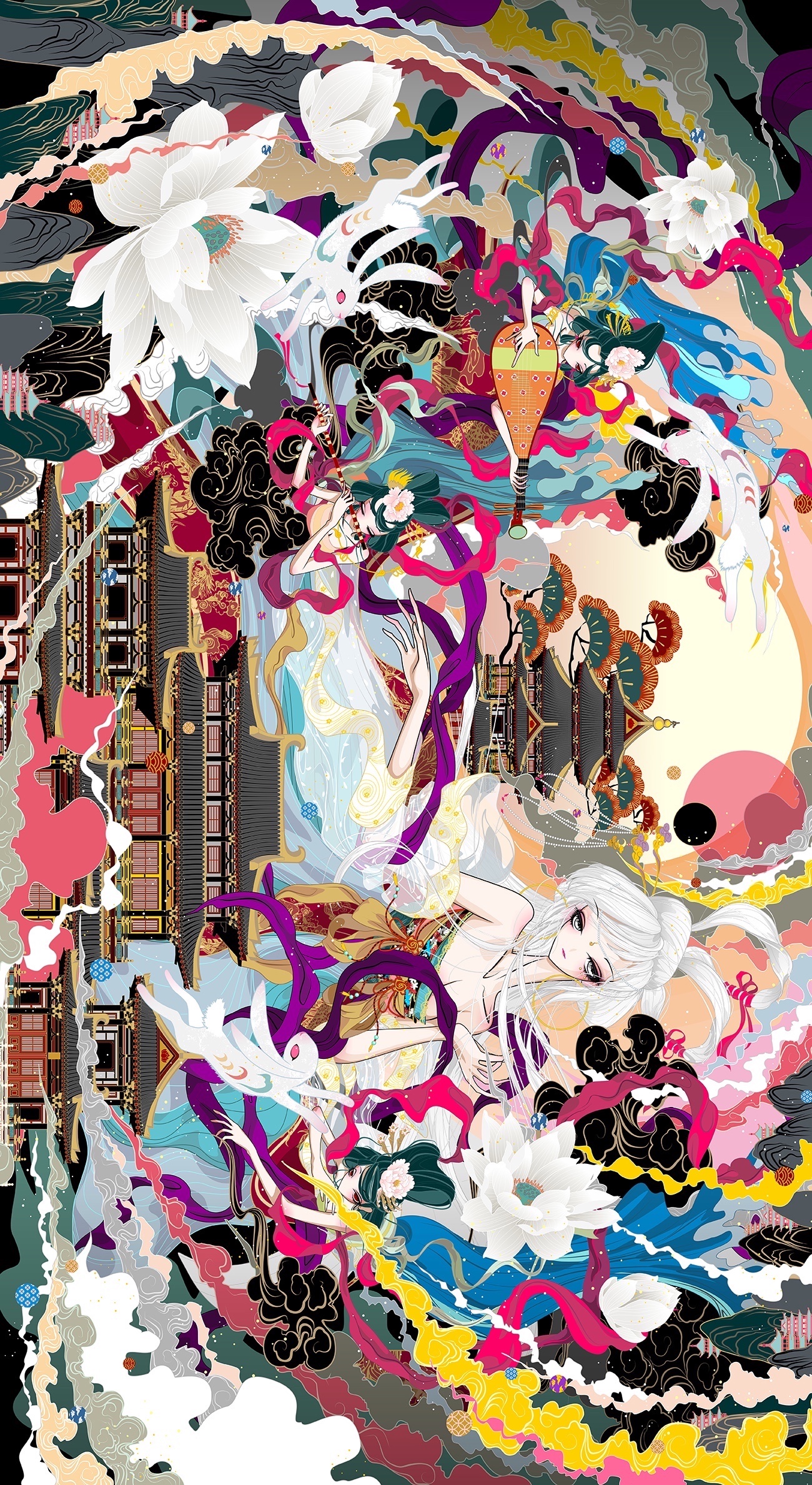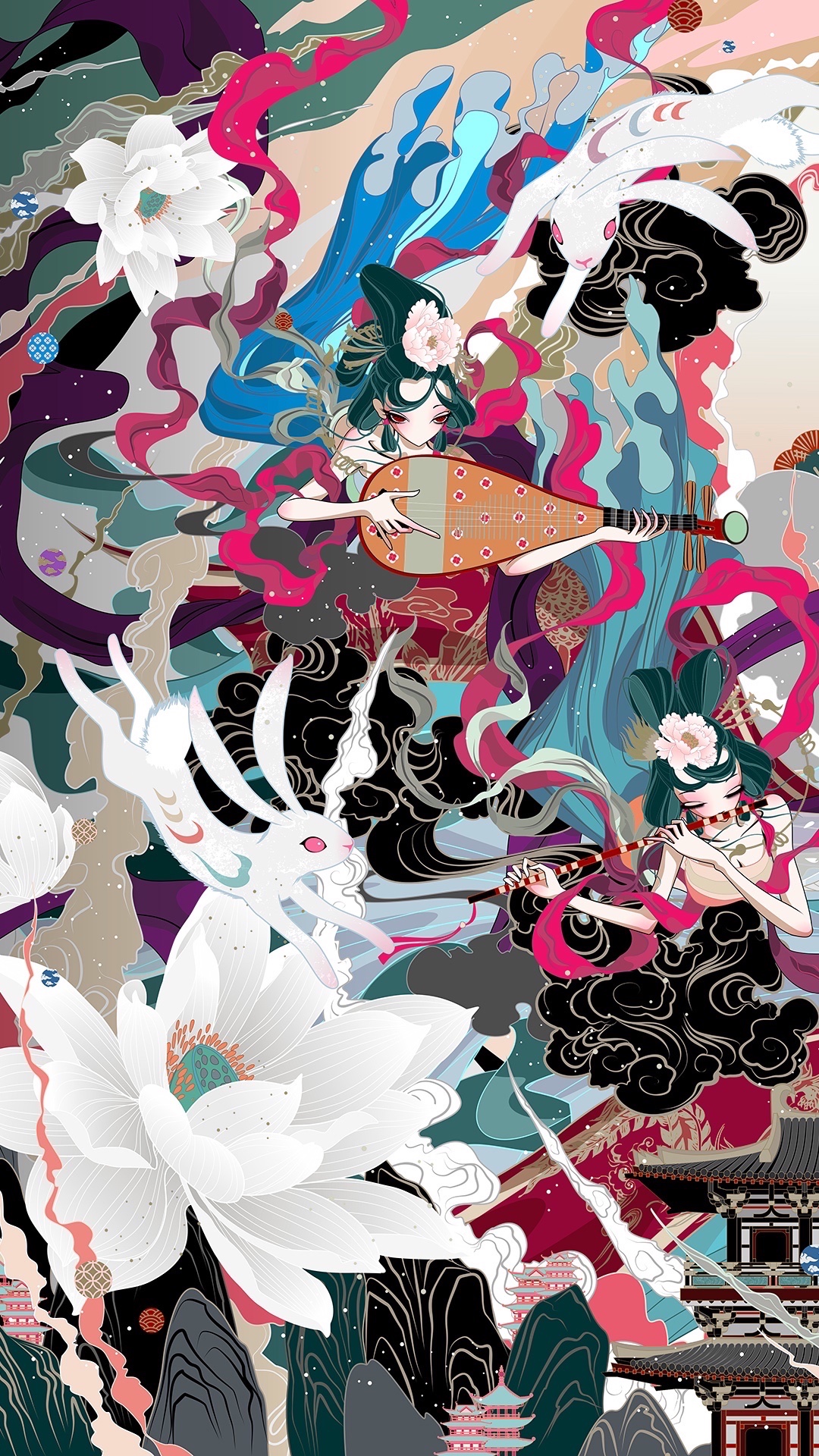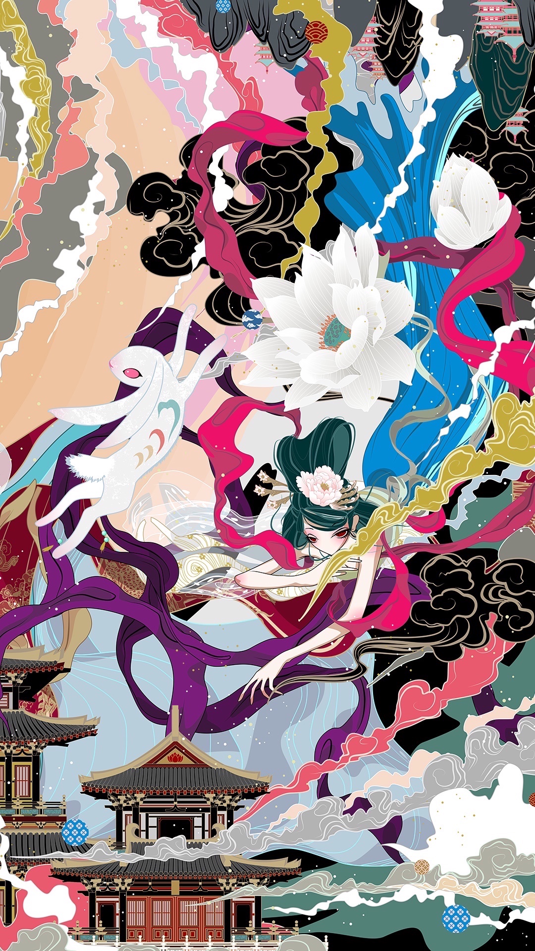 融合了神话,飞天,嫦娥奔月,三兔纹样,唐式建筑的画作