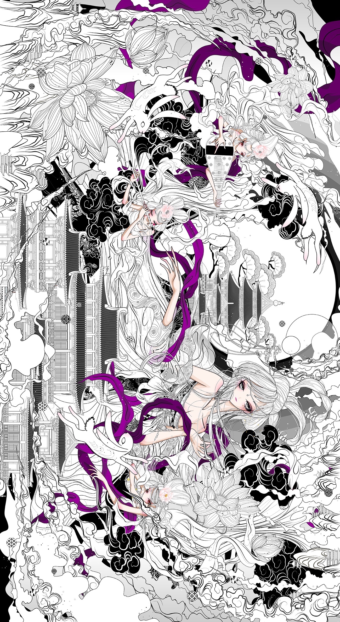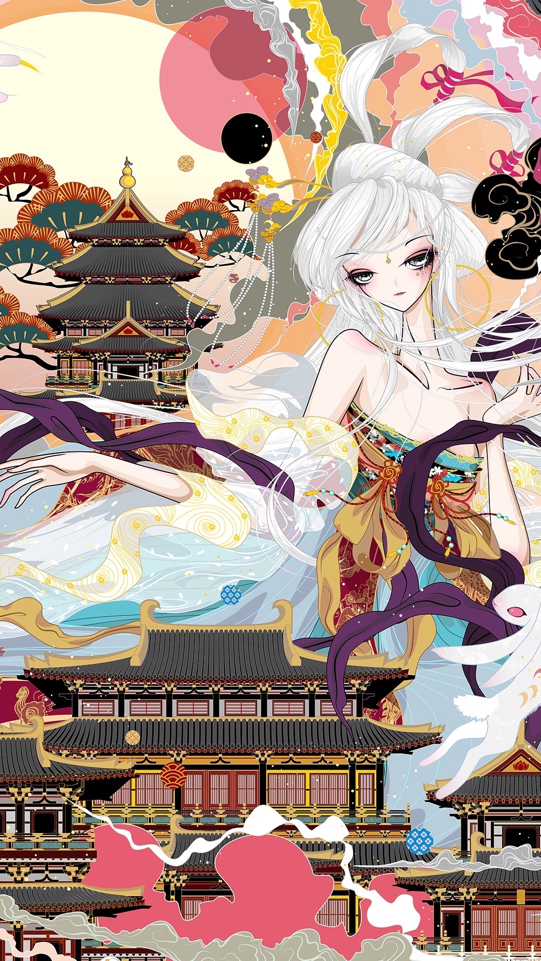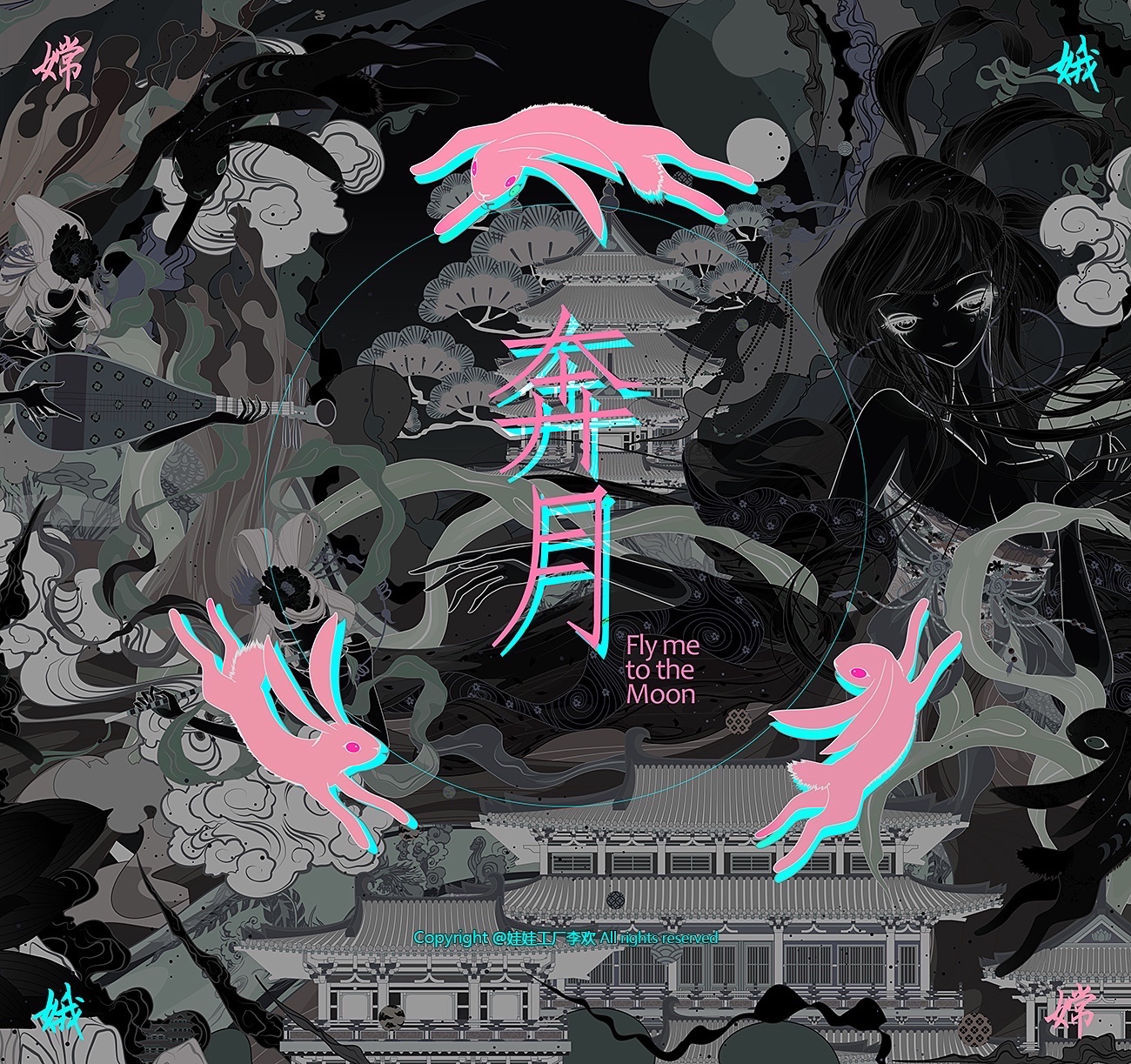 融合了神话,飞天,嫦娥奔月,三兔纹样,唐式建筑的画作