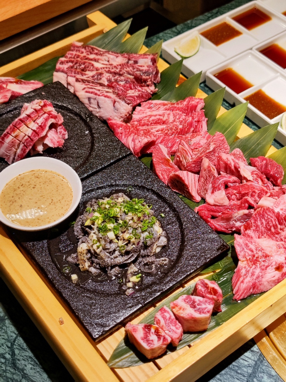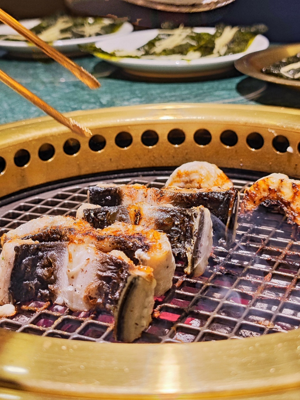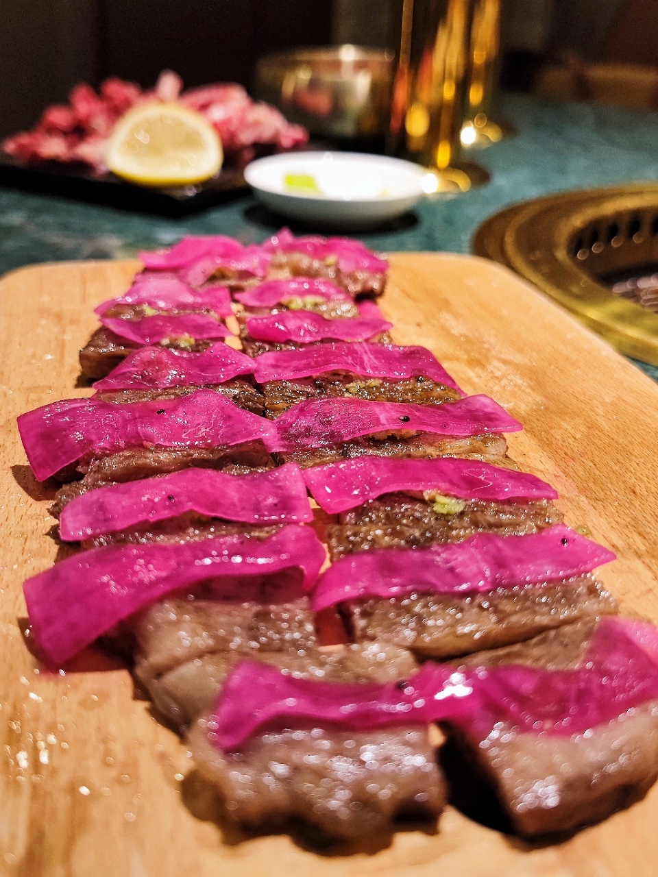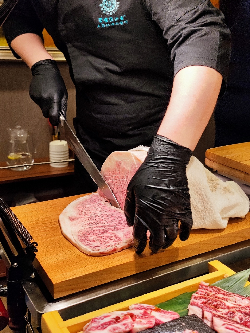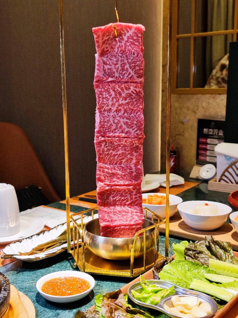 民达来横膈膜 🥩部位很是稀缺,每头牛🐮只能出两公斤不到,看起来非常漂亮,有着清晰的雪花纹,经过炭火的炙烤口感紧实也非常Q弹,配烤肉汁更是美味~😋