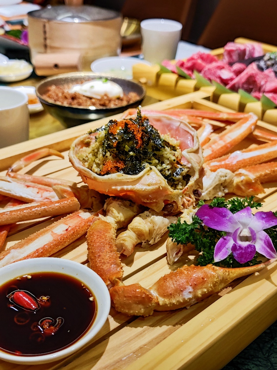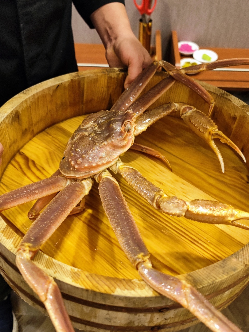 松叶蟹 🦀鲜活,一进门就能看到水族箱里养着超多螃蟹,现吃现捞,后厨会端到桌边给客人展示,每只螃蟹在2斤以上,相当壮观😍。一蟹三吃花样繁多,蟹腿炭烤,壳蟹黄拌米饭真的很香。😋