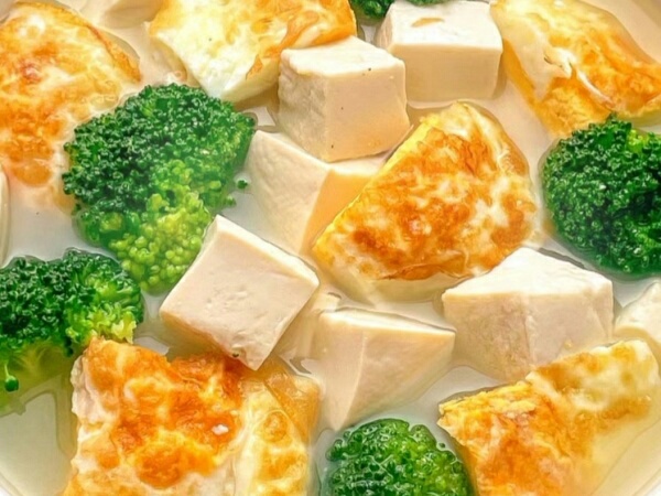 2、起锅烧油,油热后打入鸡蛋,煎至两面金黄,再切成小块,加入足量的热水,开大火煮开。然后放入西蓝花和嫩豆腐,继续煮3分钟。