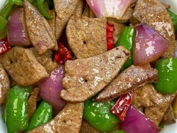 2.清洗干净青椒和洋葱,然后切成小块备用,接着热锅烧油,油热以后,倒入腌制好的猪肝煸炒,煸炒至猪肝变色熟透后,盛出备用。