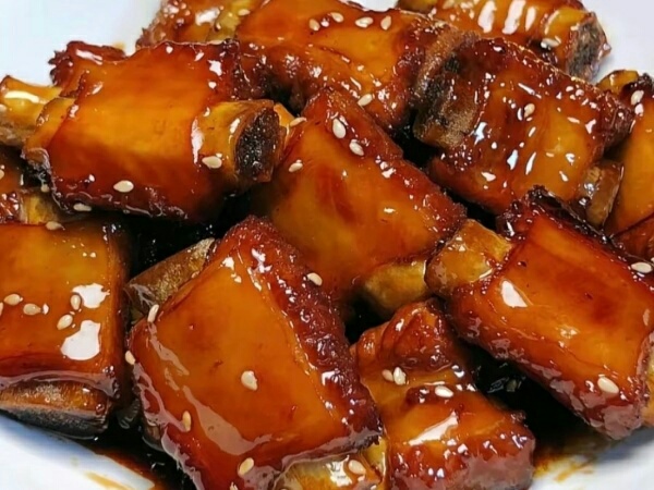 2.热锅烧油,油热以后,放入一把冰糖炒糖色,炒出冰糖融化后,再倒入排骨一起翻炒均匀,裹上糖色。
