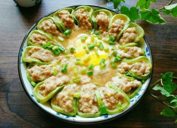 烫过后过一遍凉水,给每片西葫芦上放些肉馅,再放进盘内摆好,围城圆形,中间放上剩余的肉馅,打入鸡蛋。