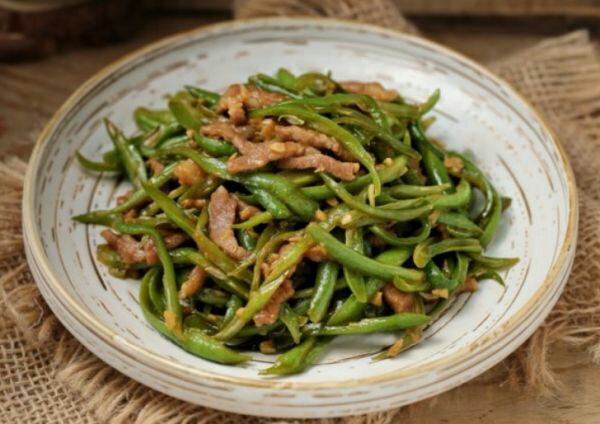 接着加入少许水,盖上盖子焖几分钟,豆角熟后,倒入肉丝,加入盐、鸡精快速翻炒均匀,就可以出锅了。