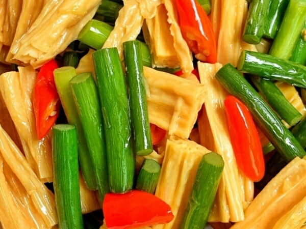 准备食材:蒜苔,腐竹,小米辣,蒜末。