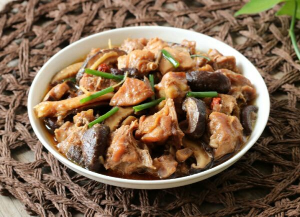 用三黄鸡或者鸡腿都行,剁成小块,清洗干净,沥干水分。干香菇提前浸泡,泡发后清洗干净,切成小块。枸杞清洗干净。