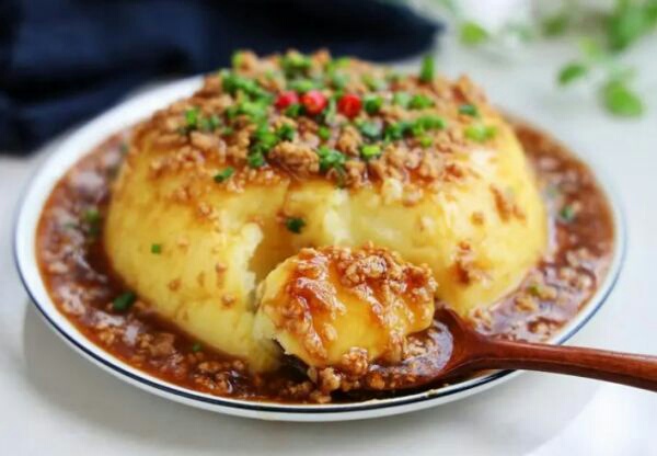 用叉子拢出火山的造型,也可以装进小碗,倒扣进盘内。最后浇上肉末,这道菜就做好了,非常好吃。
