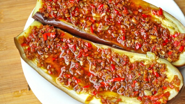 6、茄子也打好了,对半切开,用筷子把茄肉扒一扒,酱汁淋上去,现在还不能开吃,放微波炉继续转6分钟,同样的也可以蒸;