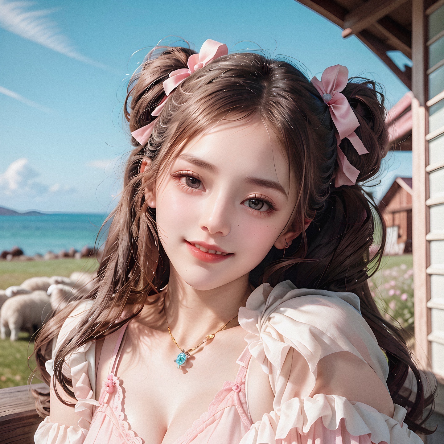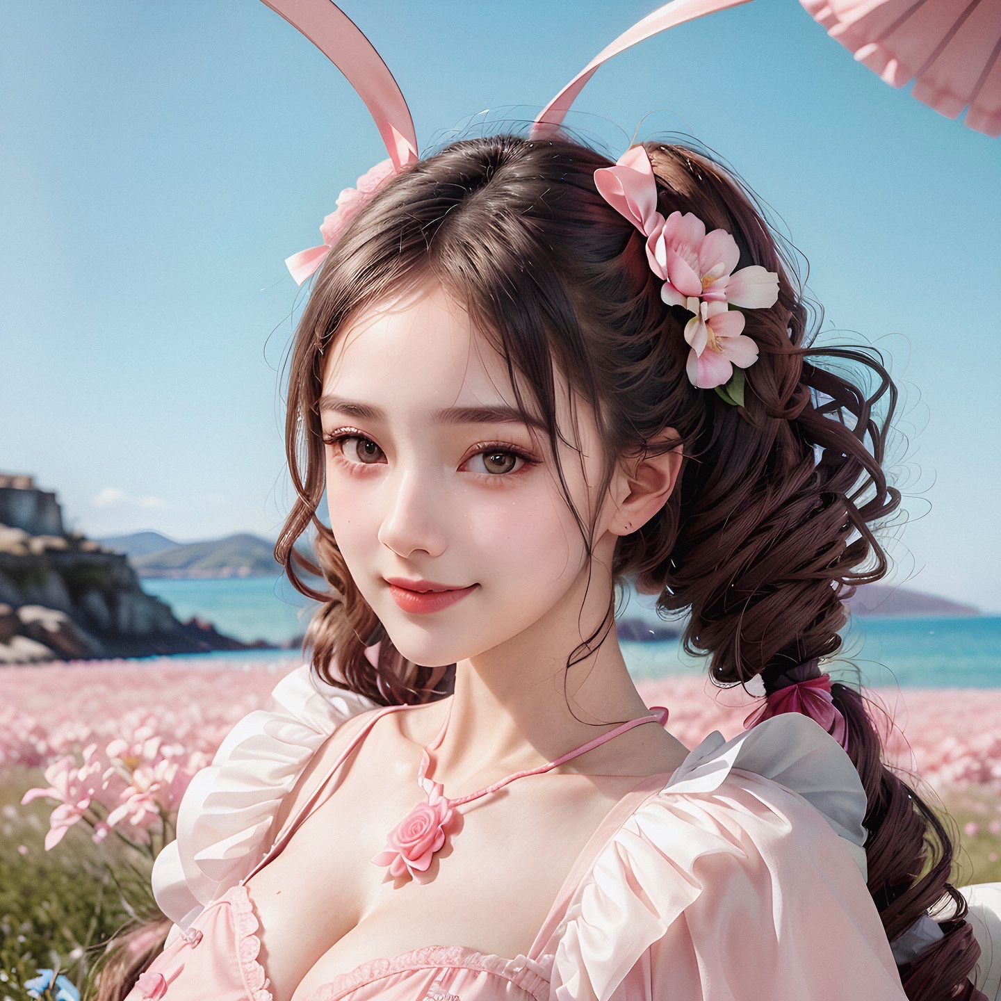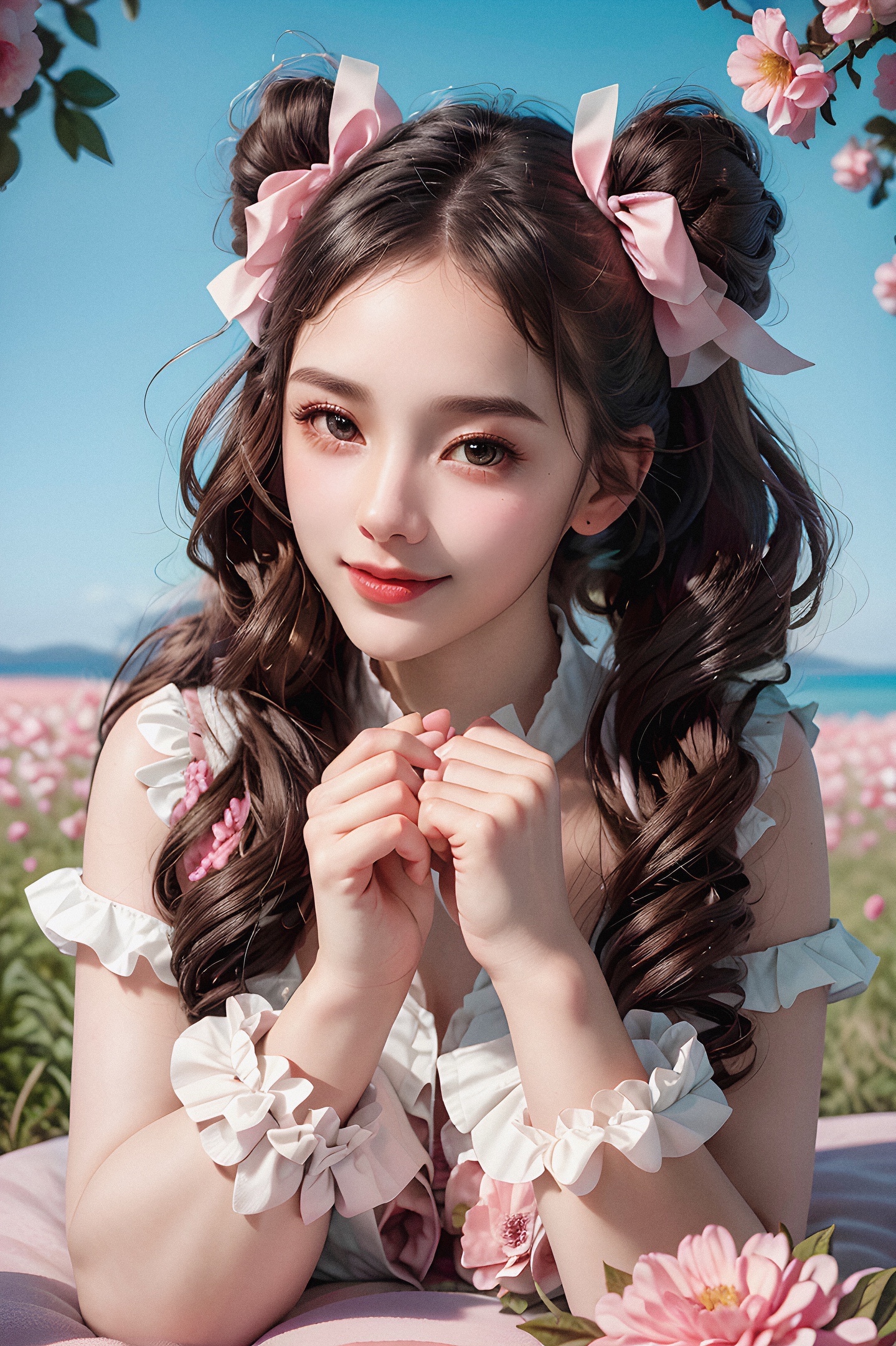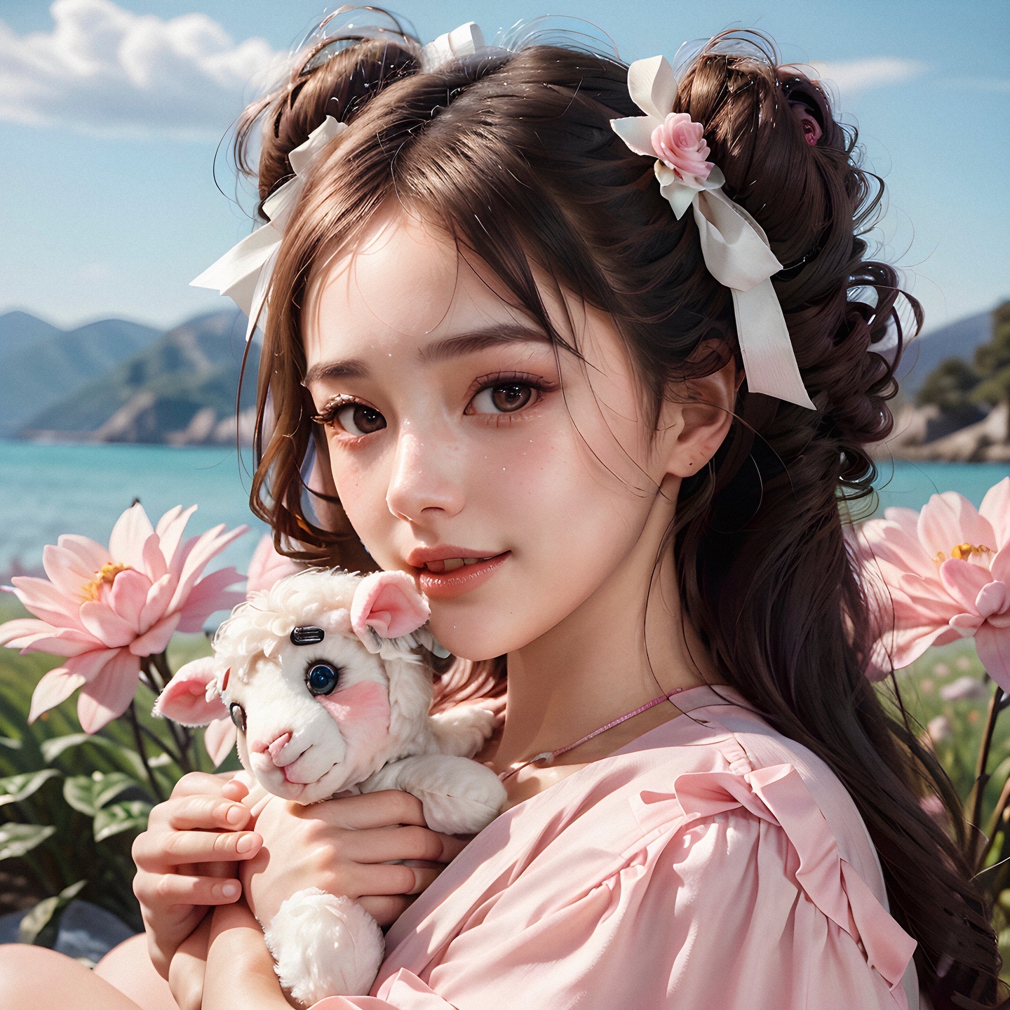这完全是一幅甜美至极的童话梦境,充满魅力与粉嫩姣好,简直如同仙女故事里的场景。广袤无际的粉色花海、毛茸茸的羊群和白色糖果包裹的花朵使整个画面变得更加梦幻。少女白皙而健康的肌肤和复古可爱的服装点缀其中,构成这粉红色仙境。