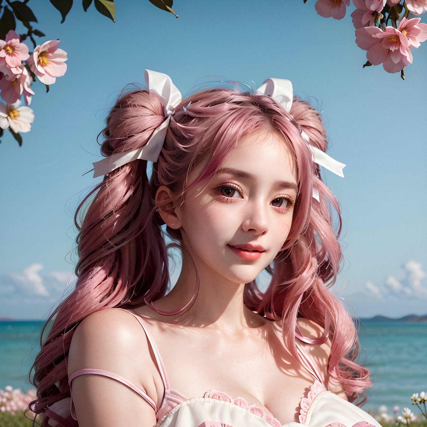 她脸上带着迷人甜美的微笑,身着一件复古优雅的粉色蕾丝洋装,颈部系着粉色蝴蝶结蕾丝花结,遮盖住身上大部分皮肤。一对可爱的双马尾发型上系着粉色蝴蝶结。