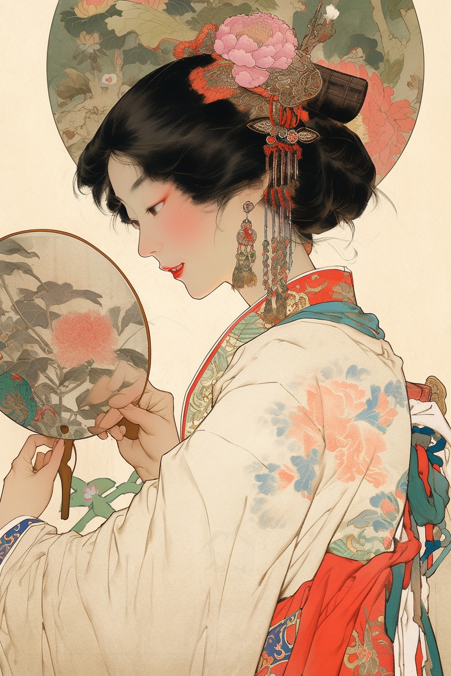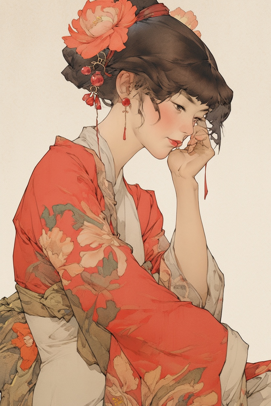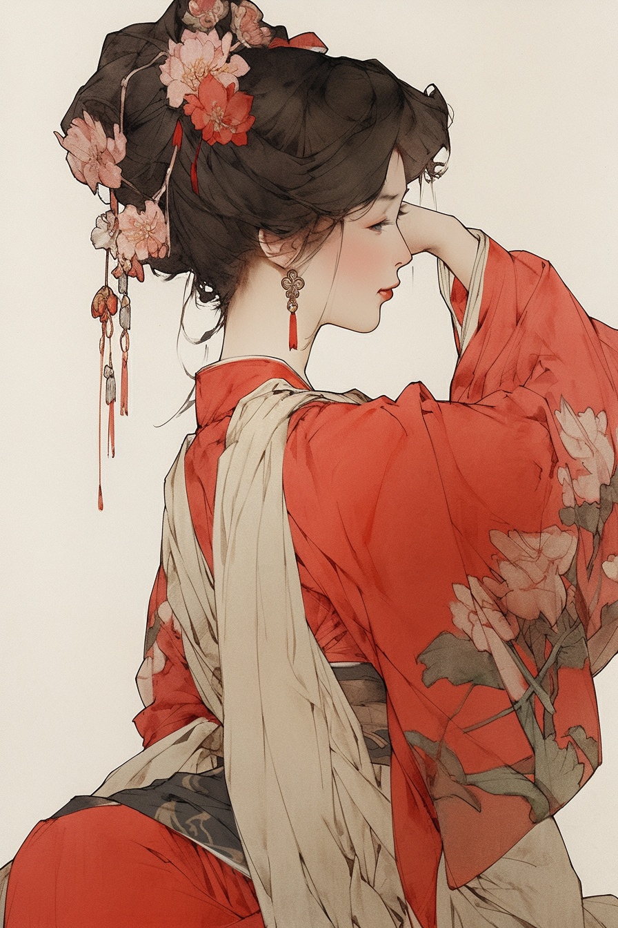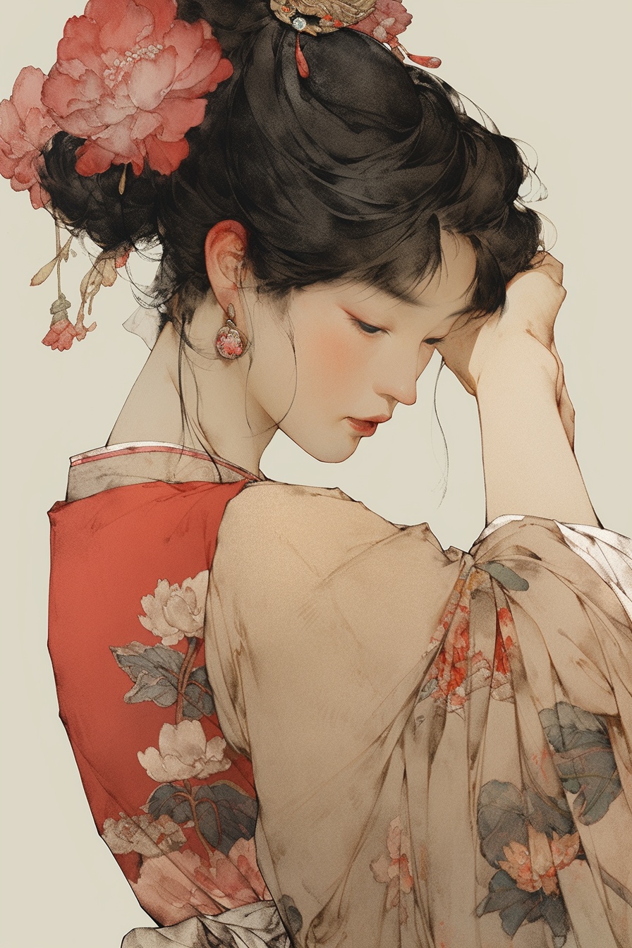 草稿图,在研究簪花仕女图的生成放法。目前能实现工笔的画风,但是人物整体还是有点偏和风,花的位置也需要调整