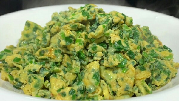 4.锅烧热倒入少量食用油,油烧热后,再加入小勺食用油,把韭菜倒进去翻炒15秒,把鸡蛋液倒进来,再用铲子不停推动,将鸡蛋炒制定型铲成大块,加入一勺食盐,生抽,鸡精翻炒入味。