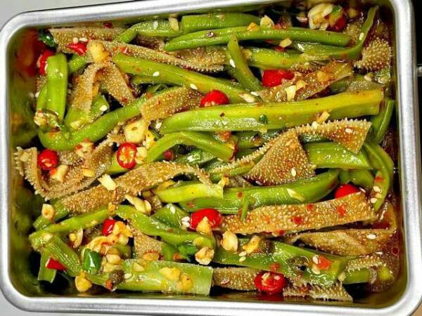 3、毛肚可以和其他爽脆口感的蔬菜或者肉类凉拌,比如海蜇丝,海草,跟酱汁搅拌均匀后,放冰箱冷藏一夜后口感更佳。