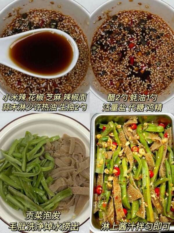 主要食材:毛肚,贡菜,小米辣,花椒,白芝麻,蒜末,辣椒面,热油,生抽,醋,蚝油,代糖,鸡精,如果找不到贡菜就用莴苣代替,口感一点也不比贡菜差,价格更实惠。