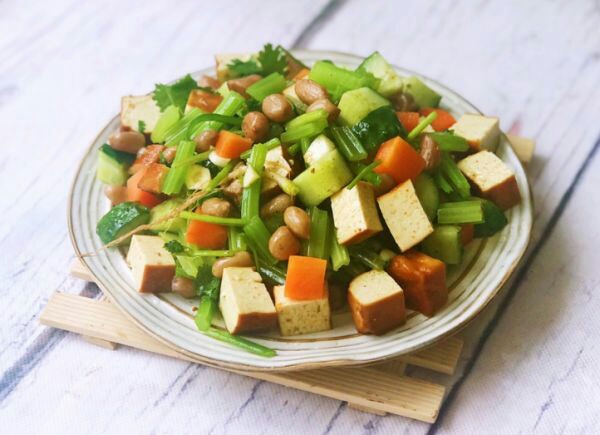 准备一些食材,分别有芹菜、豆干、花生米、黄瓜、胡萝卜、香菜。