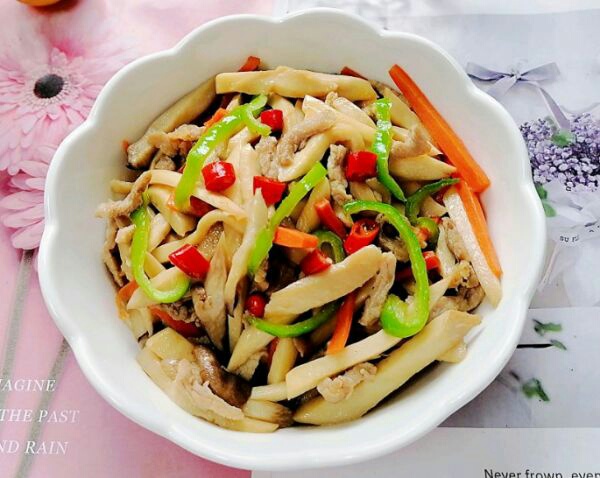 接着倒入杏鲍菇翻炒,炒到杏鲍菇变软,再倒入肉丝翻炒均匀。