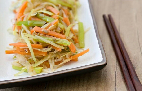 3. 加入胡萝卜丝,加盐、鸡精调味,快速翻炒均匀。