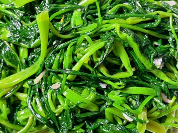 3.炒至空心菜断生后,再加入一小勺花生油和少量鸡精调味提鲜,继续翻炒均匀,即可出锅