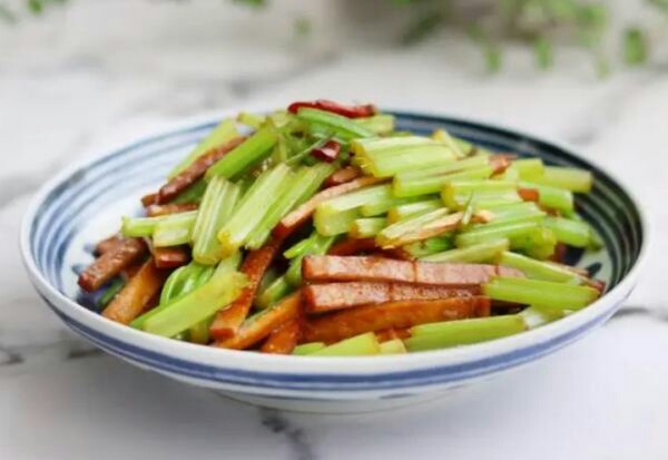 锅内加油,烧热后倒入蒜末爆香,再倒入芹菜翻炒,炒到断生。